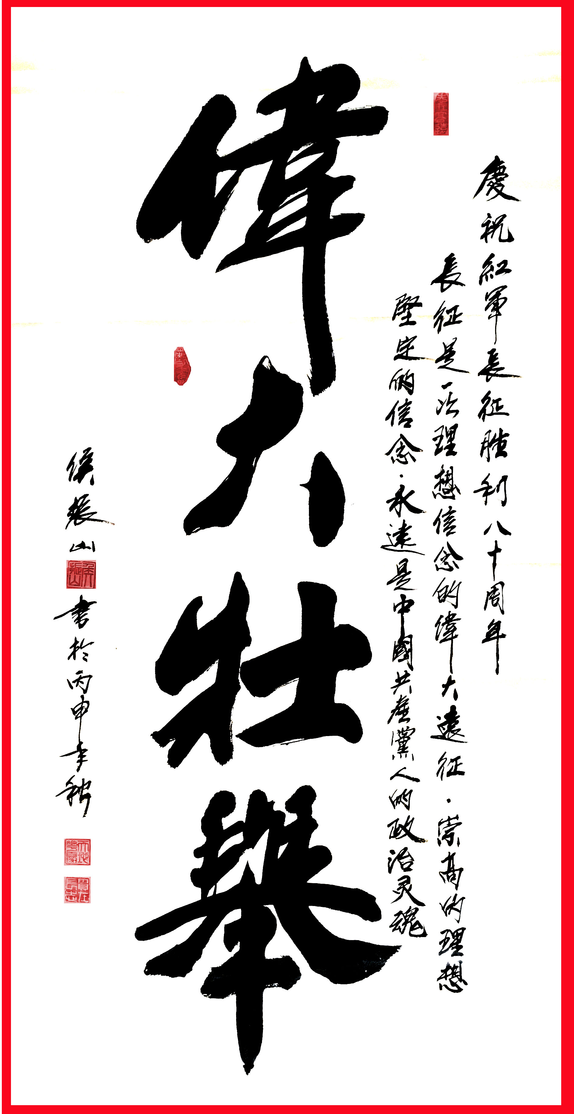 侯振山武官5岁跟父亲学习书法,7岁拜师习武。军旅40年书法研究临池不辍。他的书法: 运笔洒脱,浑厚有力;笔路独特,文武意足;刚柔融合,豪气励人。南北边疆哨所、西沙南沙岛礁都留有他鼓励官兵奋进的墨迹。他的书法作品表达是一种大气、一种豪气、一种英气和一种励气。欣赏过他的书法作品之后,大都被他字体行墨间所散发出的那种磅礴大气、浩然正气、浑厚钢健的豪气所震撼。其书法作品曾以国礼赠送。