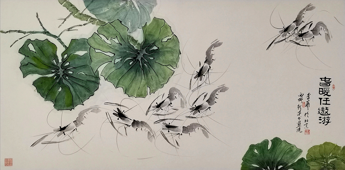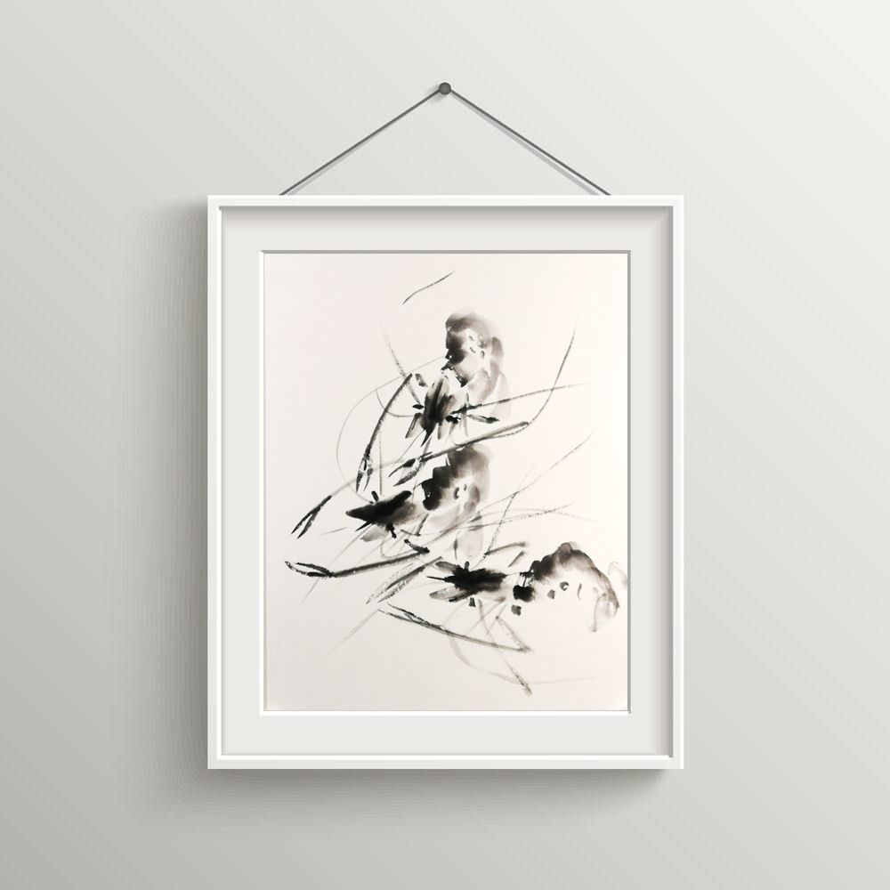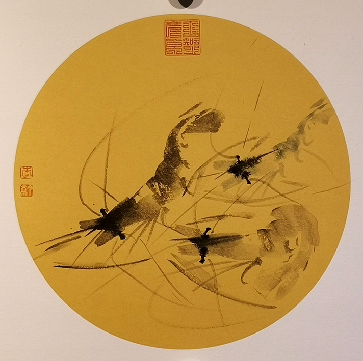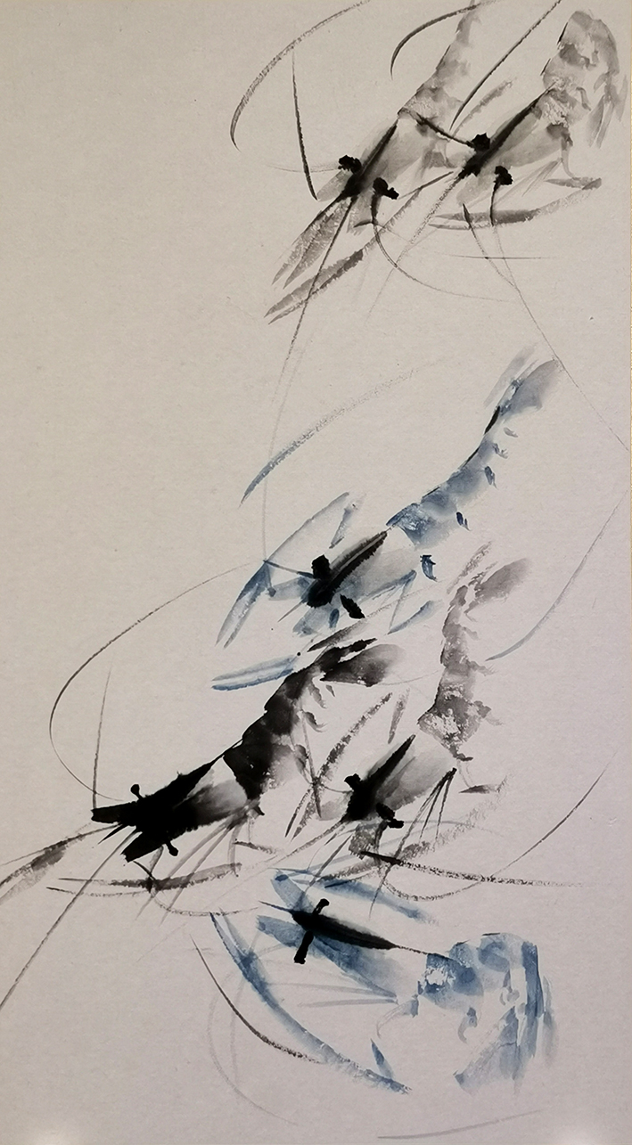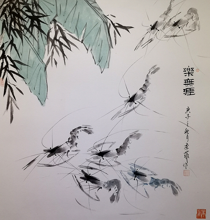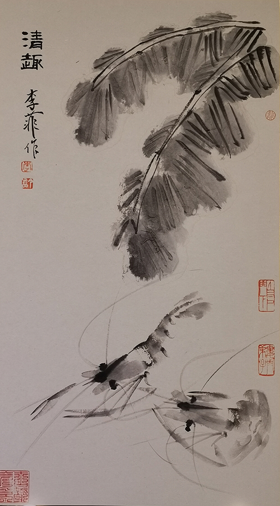 在学习齐派艺术的创作中,李菲(今卓)尤其对画虾情有独钟。其水墨虾作品大胆突破,用焦墨大写意与水墨浓淡之间的交融错落之变化表现出虾的硬朗与灵动,令作品更加生动,活灵活现。其笔墨充盈而具神韵、线条苍劲舒展且有新意的作品被多家企业、名人、画廊、艺术机构、收藏家收藏。
