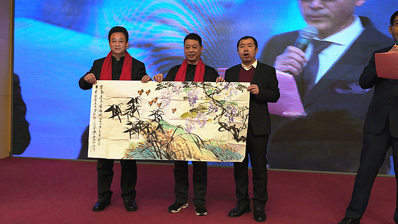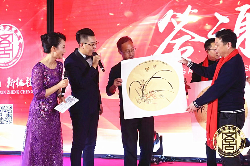 中央电视台迎春晚会。主持人董卿。马治富正在讲水墨荷花图创作过程和中国画寓意,并被收藏
