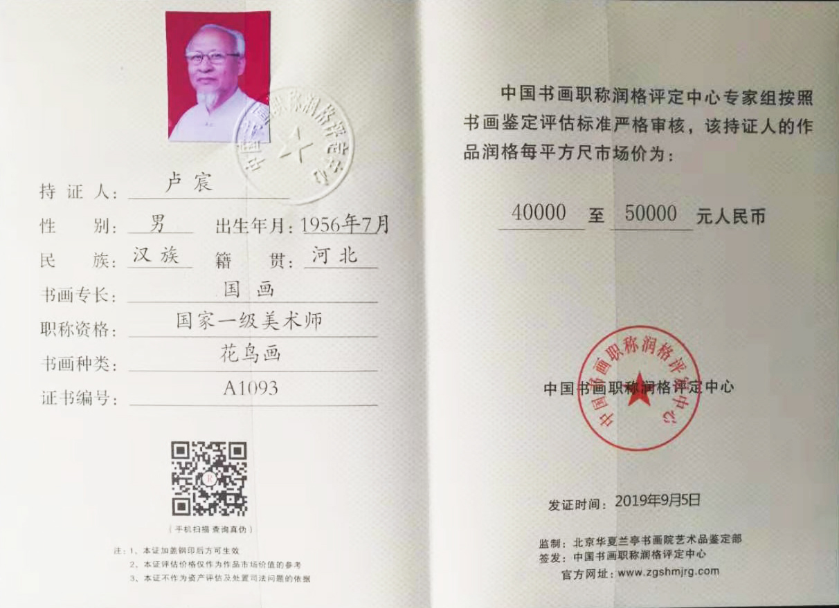 中南海国礼书画家,国家一级美术师,并终身享受艺术家资格。国家评估市场润格50000/平方尺。中国美术家协会理事,中国画研究院院务委员,中国人民大学高级研修班教务处主任。