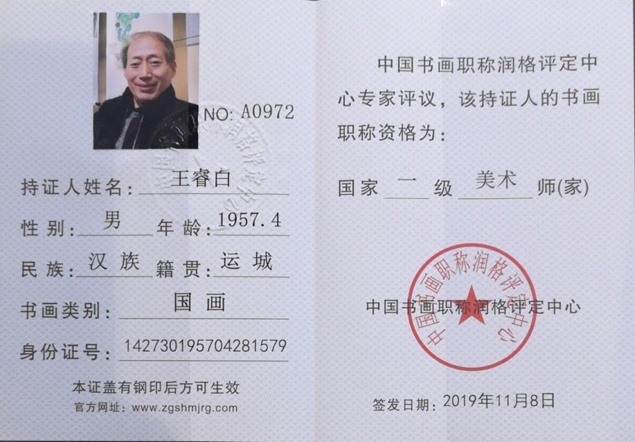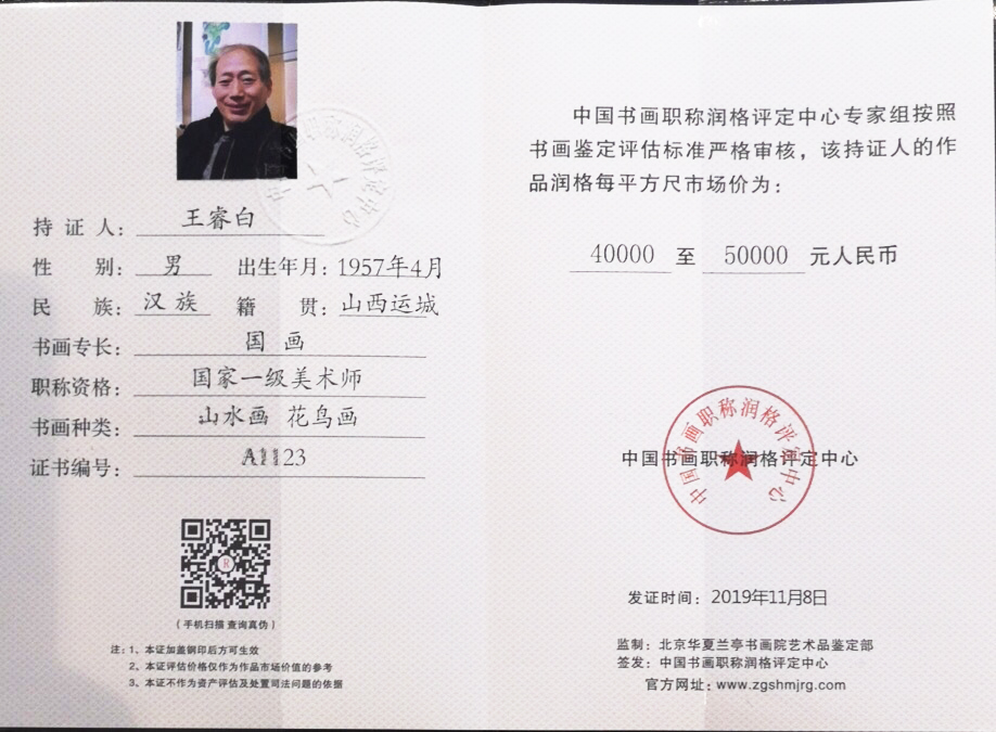 王睿白~现居北京。齐白石再传弟子 ,国宾礼特供书画家、中美协会员、国家一级美术师、作品《鸿运当头》被人民大会堂收藏。现任中国书画家研究会副会长、中国书画家联谊会理事。作品每平方尺五万元。擅长国画山水,花鸟。现为国宾礼特供书画家、北大客座教授,中美协会员、山西省书画研究院理事,国家一级美术师、中国书画家研究会副会长、中国华人书画网签约画家,中国书画家联谊会理事。曾赴韩国、巴林、俄罗斯曰本,新加坡,泰国等国家及台湾地区参加美术交流展,作品被中南海、人民大会堂、毛泽东收藏艺术馆、毛泽东纪念馆、和多个国家博物馆及领袖收藏,为中外传统文化交流作出突出贡献。齐白石再传弟子,李可染得意门生。