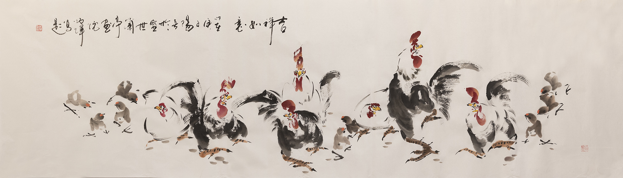 郄炳铎的鸡神采飞扬,雄鸡有一种雄赳赳气昂昂的气势,百鸡图千姿百态,寥寥几笔或立或卧跃然纸上,有展翅高飞的苍鹰有蓄势待发的鹰,把鹰的睿智犀利的眼神,大小写意虚实对比勾勒出鹰之精神。或者奔牛或者水中嬉戏的水牛,有引颈高歌的黑天鹅,有水中嬉戏的水鸟。从一幅幅精美的精彩纷呈的画面,把一位年近八旬的老艺术家对生命的热爱生活的情趣,呈现的淋漓尽致。如若白寿章、齐白石在世,当感叹花鸟水墨技艺炉火纯青。