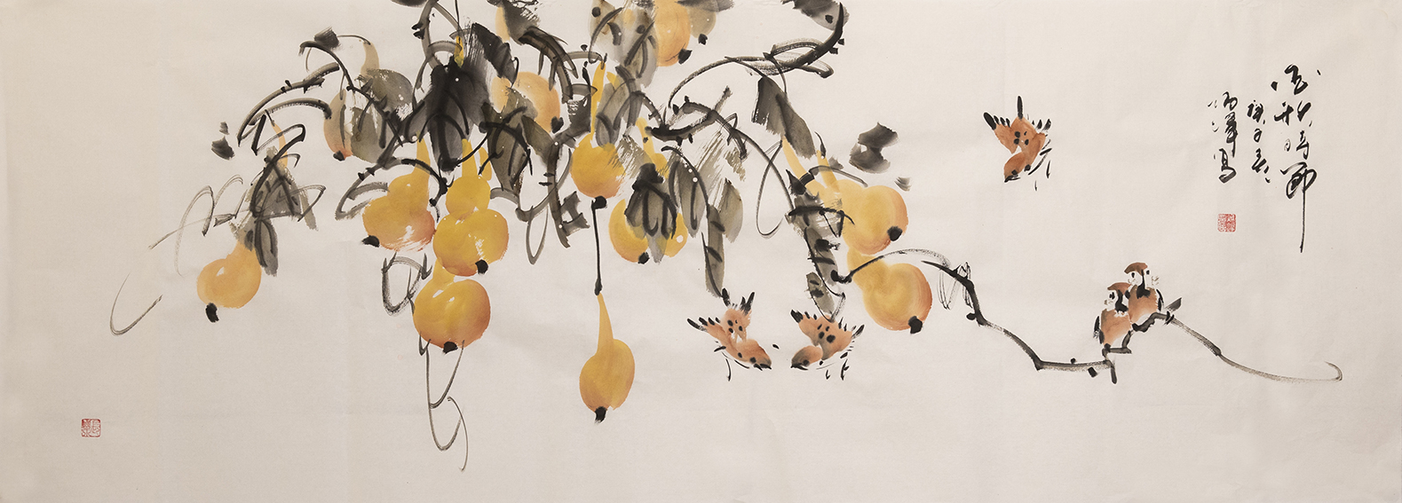 郄炳铎绘画的一个主要风格是简约、瘦劲,有继承了石溪、石涛、八大、吴昌硕的风格,在继承白寿章老师画论画风的基础上,推出”以形写神“,深深体会到要让作品具有永恒感人的艺术魅力,必须抛弃哪些“酷似”"逼真",他在自然中取材不是简单的把山石树木、花鸟鱼虫照搬到纸上,而是对所绘制的对象和精神、气质、个性和意境,下笔前在心中打好“腹稿”再动笔作画。在绘画过程中,给人一种似经意与不经意之间,信手拈来,纵横挥洒,他经常说的“作画要有新意,不可依葫芦画瓢”。如他在册页上画的藤萝金果图,枝叶与枇杷相互呼应,形成上、中、下都有画眼,横看浓墨枯枝映枇杷、纵看淡淡的坚挺的枝与浓浓的沉沉的叶子形成大块面的对比,有了这个对比,便形成了里外和远近,表现出强烈的对比效果。