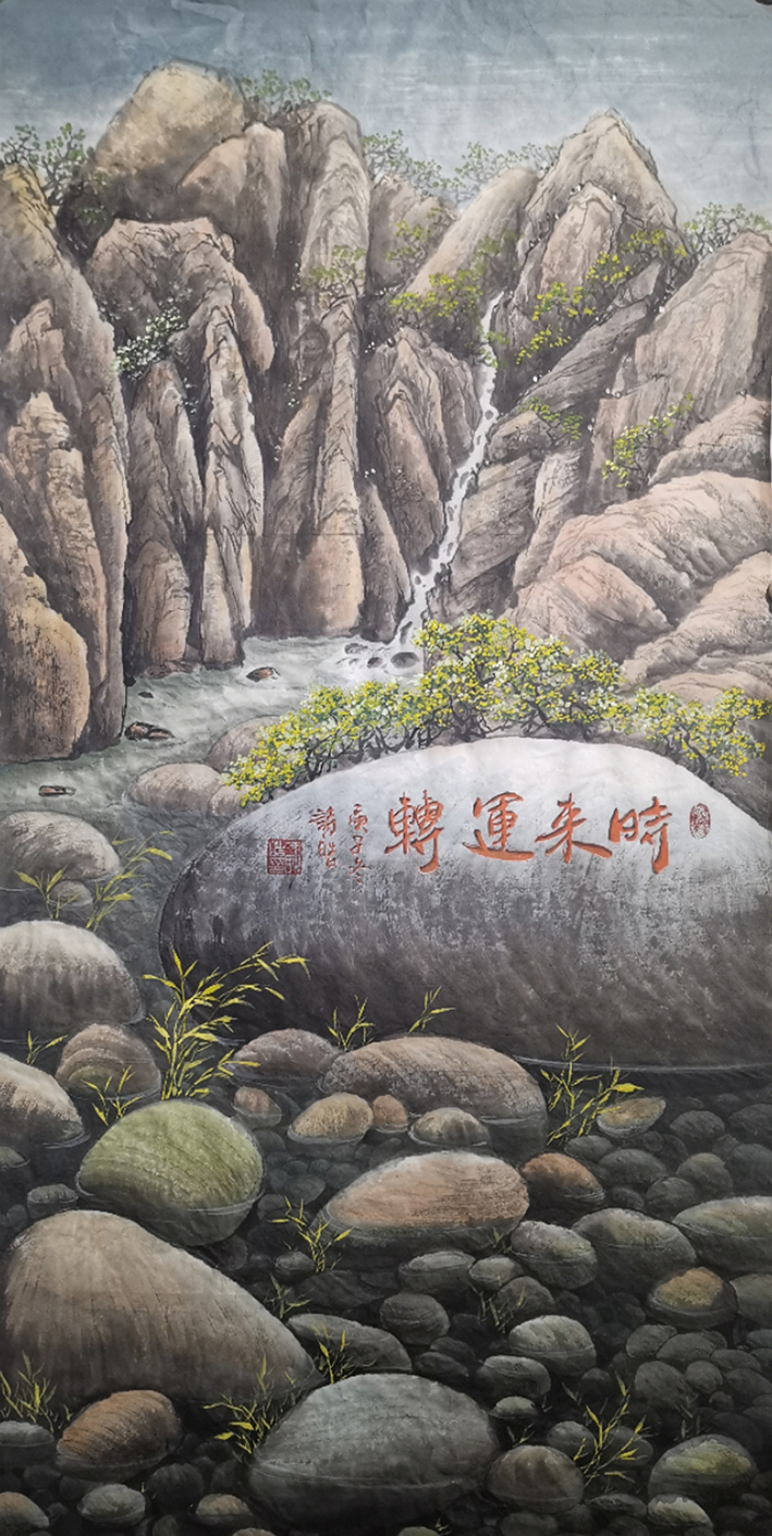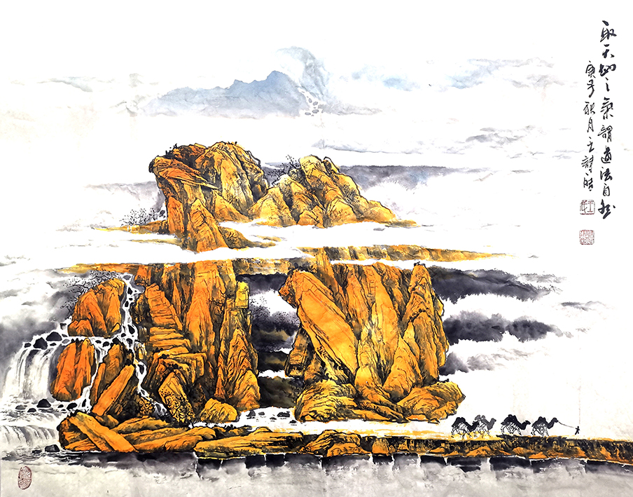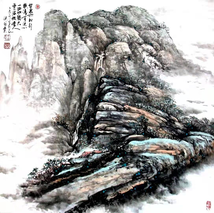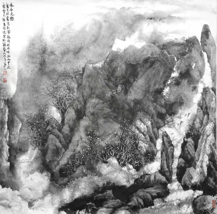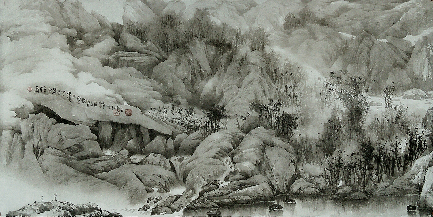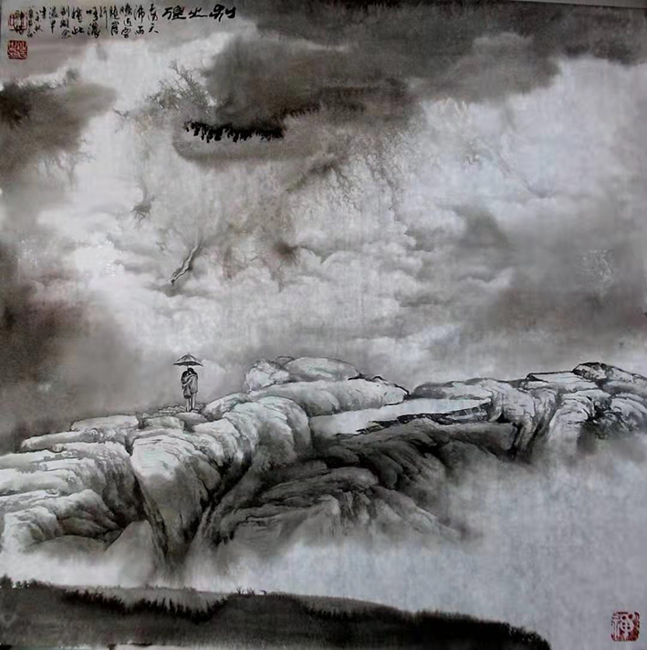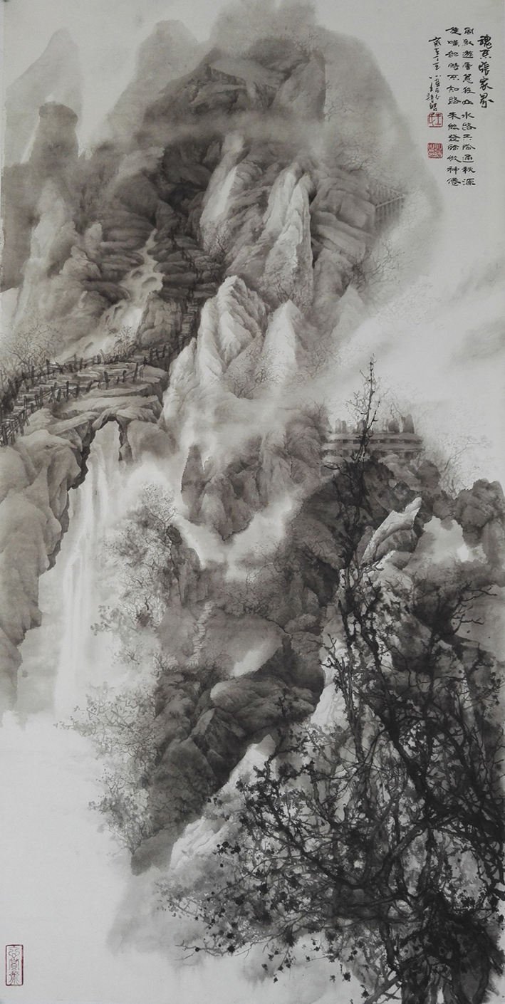 2独创“水墨染皴法”。首先,它不是技法!因为理论运用的就是最传统的基本技法即定法,如晕染,罩色,斧劈,荷叶,折带,批麻等等等等,无知之而不用,悉数纠结在一起成为了一个多元化的无法辨识的另类;其次它就是一种技法!因为法无定法,我们化有法为无法,变无法为有法。在每一种技法的实际应用中打破常规,自然出笔,皴中带染,染中出皴,自然而又在情理之中地呈现莫测不尽的变化…
