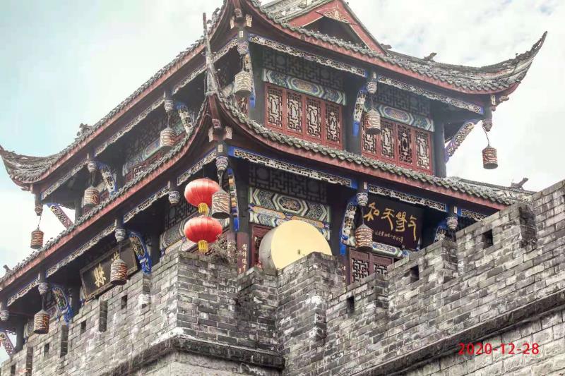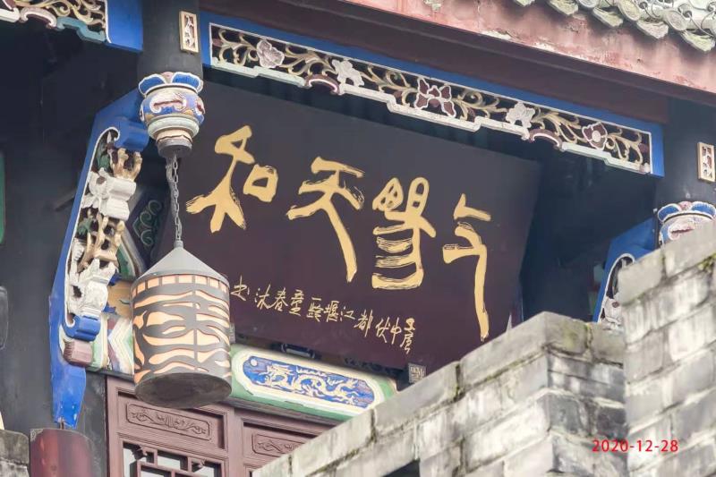 C. 书法“气畅天和”牌匾,悬挂在都江堰市中心古城楼上。2012——至今……