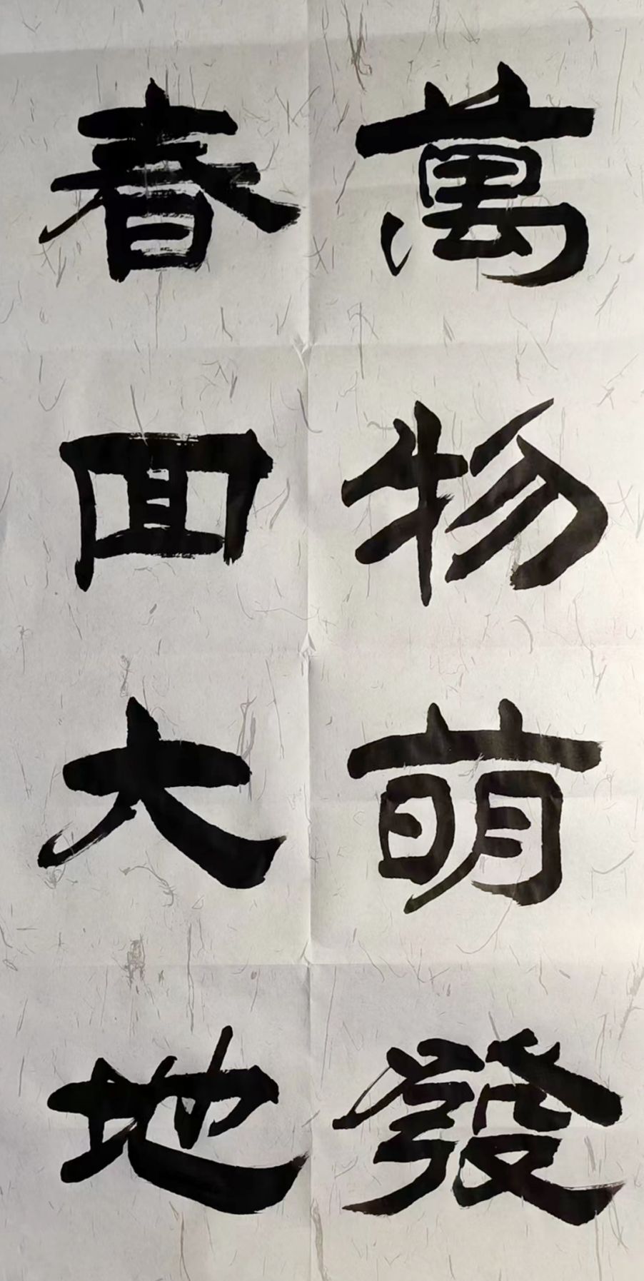 在书法上的境界、品味和水平,也决定了他在专业领域必将取得更大的成绩。他得王书之精髓,八面出锋而不失中锋之轨迹,使转提按极其自如,线条平实劲挺而富有弹性。观其用笔,如公孙大娘舞剑,流水行云,气息一贯始终。其结字,平正中欹侧多变,或扁或长,或方或圆,顺势而成,生动自然,饶有情趣。其墨法,在整体平实中追求墨块效应和字群结构,墨色鲜活,润枯有致。在章法上,更是精心创制。