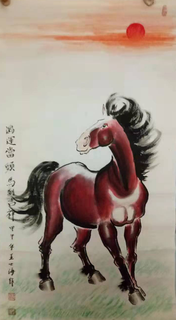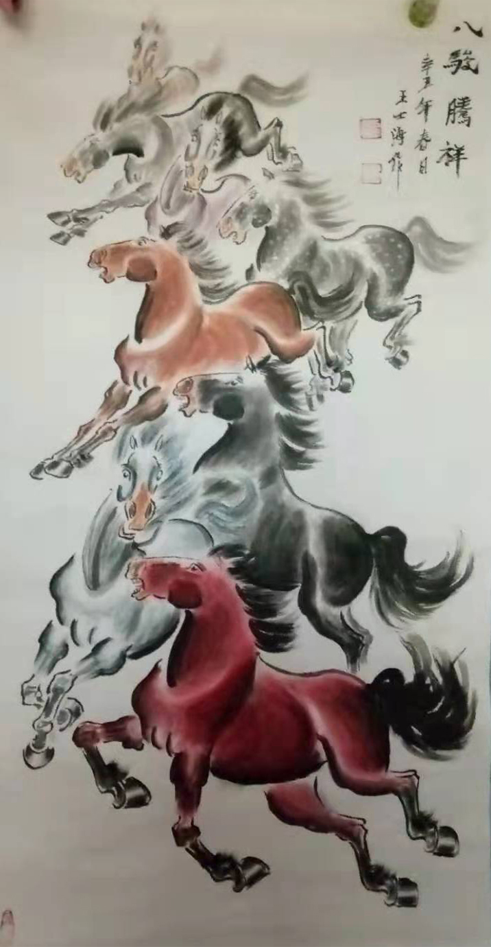 王士海1951年11月25日生于北京巿朝阳区管庄,自幼酷爱画马,授马晋.刘心安画马大师的影响,画工笔马,授过刘心安大师的亲点,多年潜心致力于画马艺术的研究和创作,特别是徐悲鸿大师画马技巧及理论,几十年创作大量马的作品已有数千张作品被民间收藏,市面发行的邮政邮票马图案也是采用我提供的画稿,近年参加国内外拍卖活动,多幅作品被海外人士收藏,多次为企业家创作大幅八俊图,现为中华国礼艺术家、国家一级美术师,现被评为中国书画百年巨匠传承人。