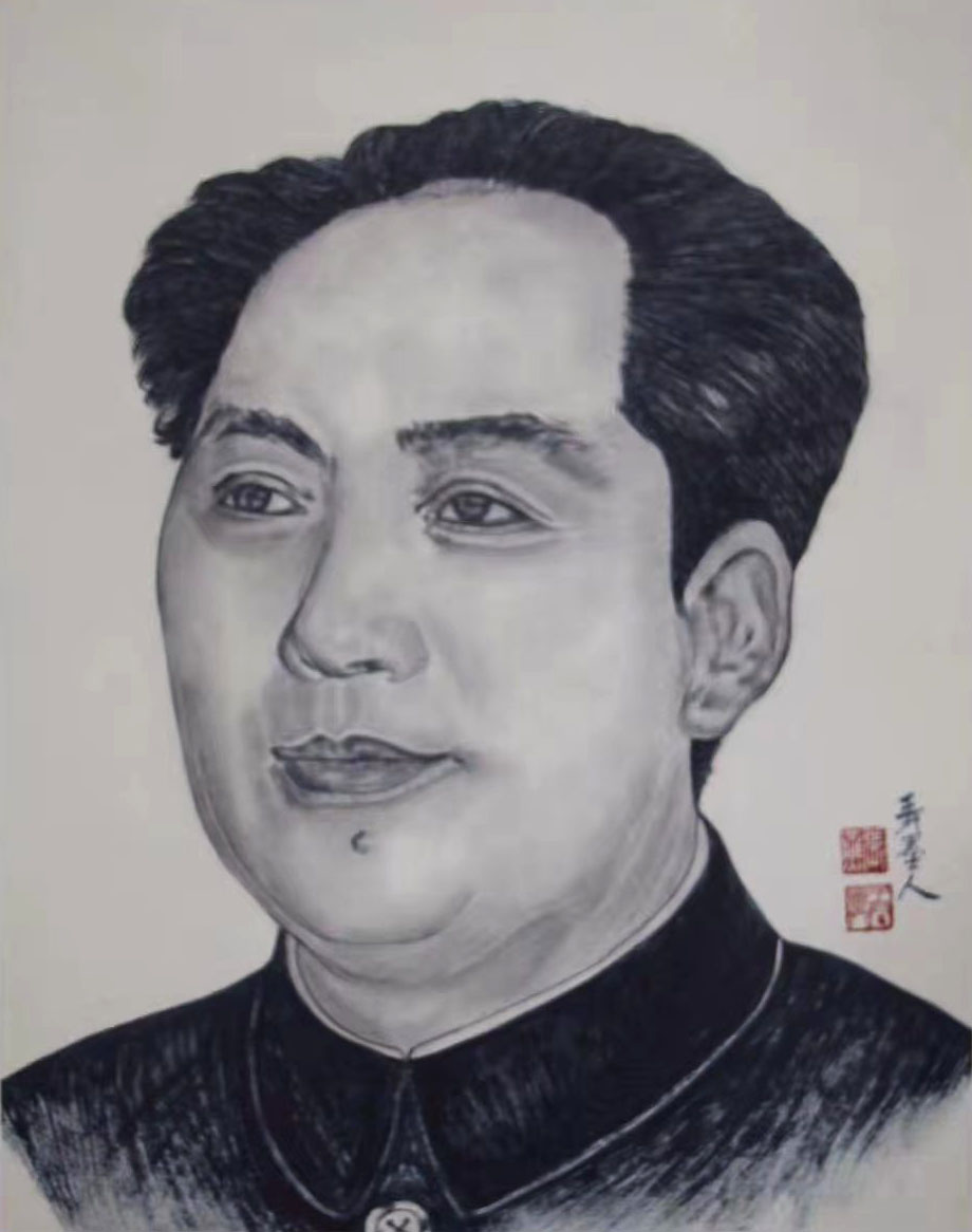 2018年12月22日 在北京湖南大厦举行纪念毛主席诞辰125年大会,弄墨人受毛主席诞辰125周年组委会的邀请:为毛主席的女儿李纳画主席像一幅。由毛泽东书法继承研究院院长沈德福先生在上面书写毛体书法《数风流人物还看今朝》。
