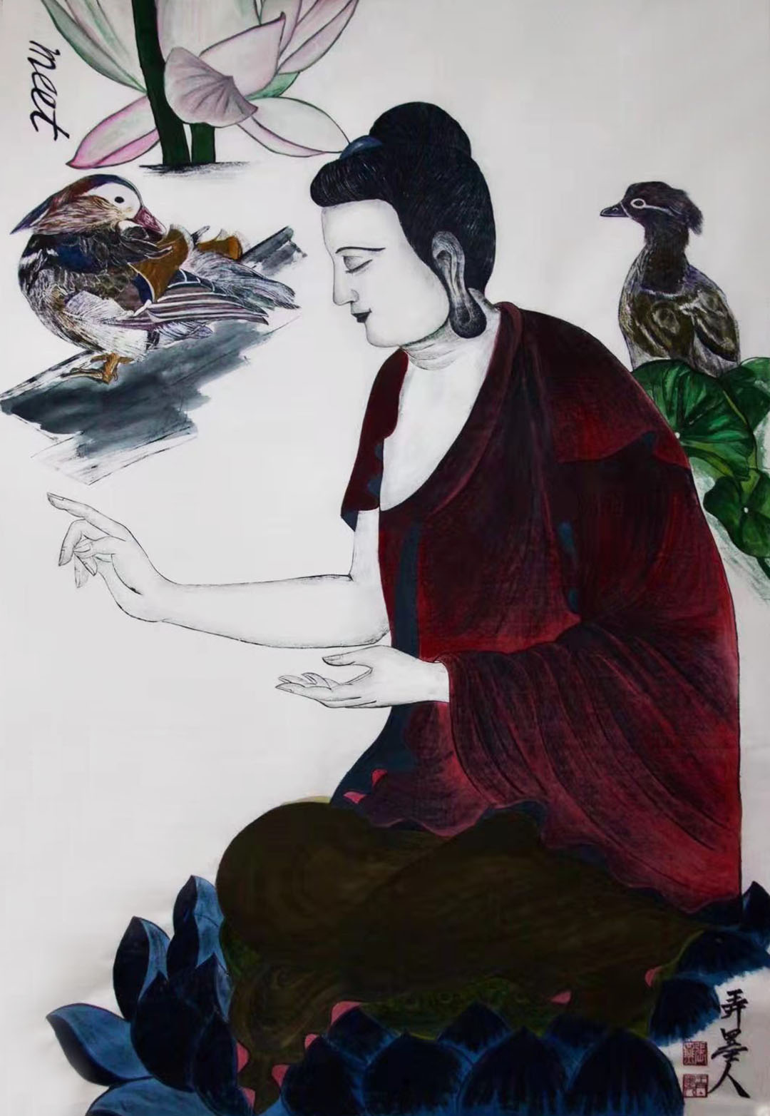 2018年马牧老师与弄墨人受邀:参加广州东华禅寺两岸佛教会议,并献给万行方丈两幅巨幅佛像:阿弥陀佛和观世音菩萨,并在禅室陈列释迦牟尼大佛一幅。并约好在这里开一场世界级的99幅三联套的佛展:弄墨人画33幅佛,马牧写66幅对联。(弄墨人根据寓言故事或佛歌的词曲作画,马牧根据画面的含义作诗并写出对联),珠联璧合,首创此种合作,把佛的精神献给人类,传递“美”的作品,世界和平,人民幸福。