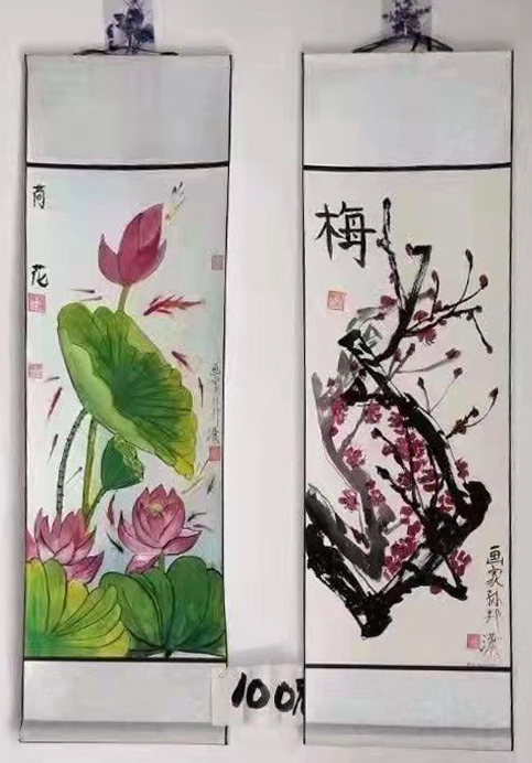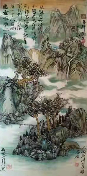 除了画梅,孙邦潇还擅长山水创作,观其作品,幅幅皆用笔凝练,墨韵通达,那线条的粗细、干枯,点画的浓淡、疏密,随心所欲,运用之妙,存乎一心,清新的格调中,伫立的山峰,环绕的溪流,苍松翠柏都在流光溢彩中展现着大自然的绝美秀色,仙境般的景致,让观者惊叹不已。他作画,取象不惑,笔法洒脱而恣肆放达,气象跌宕奔腾但不失倜傥风流之态,无不体现了其扎实的功底。