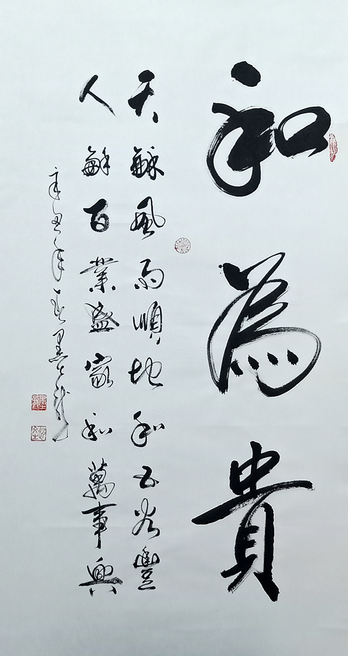 他的书法作品中常常蕴藏着精神的力量和生活的智慧,始终体现出时代的正能量,让人产生情感和价值观的共鸣。正因为这些原由,他的书法作品也就有了一种别致的艺术韵味和高阔的艺术魅力。读之、品之、赏之、思之,你在艺术享受的同时,又像在听一位学养深厚的长者的娓娓叙谈……这就是艺术,这才是当代正向艺术的魅力所在。