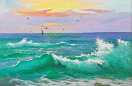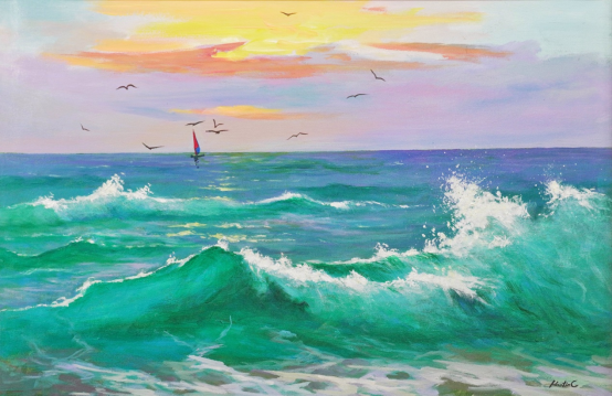 “乘风破浪会有时,直挂云帆济沧海。”这幅《乘风破浪》是青年油画家郝亭的海之韵系列经典题材,画面波澜壮阔,大面积的冷色调由近至远层层递进,暖色的天空霞光璀璨,让神秘的大海多了一份甜蜜和温暖,一群海鸥翱翔在广袤的海面,一叶扁舟乘风破浪,勇往无前。细腻逼真的写实手法以小见大,方寸之间尽显天地苍茫、广袤辽阔的气象,世界上最宽广的是海;比海更辽阔的是天;比天更博大的是勇于破浪前行的胸怀!