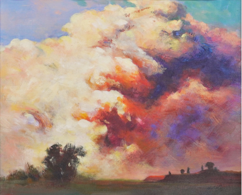 “千形万象竟还空,映水藏山片复重。”这是当代油画家郝亭的云朵作品,整个画面祥云缭绕 ,变幻多姿,意象万千、波澜壮阔。画家用笔着色欢快明亮,笔痕纵横捭阖,寥寥数笔,光芒力透云层,色彩斑斓如梦如幻,冷暖互补和谐相生,神秘的天空给人以无限的憧憬和想象,多姿多彩的午后让人神清气爽,坐看云卷云舒,是一种从容,笑看风起云涌,则是一份坦荡!