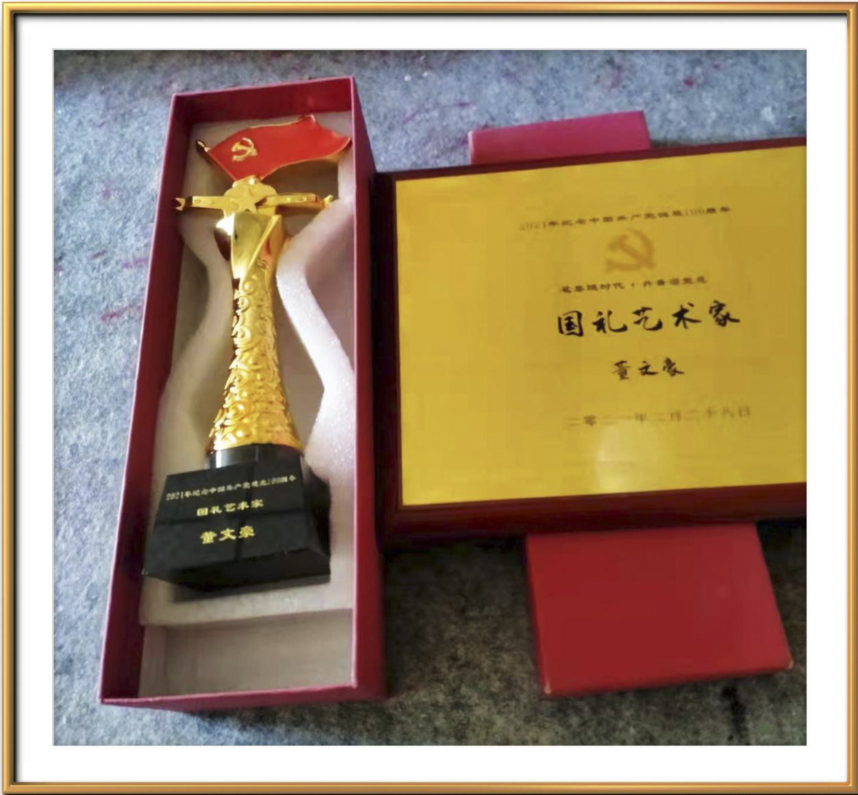 2021年2月在纪念中国共产党成立100周年,“建党百年——艺术家献礼主题展”中,荣获“德艺双馨艺术家”荣誉称号,并颁发荣誉证书。