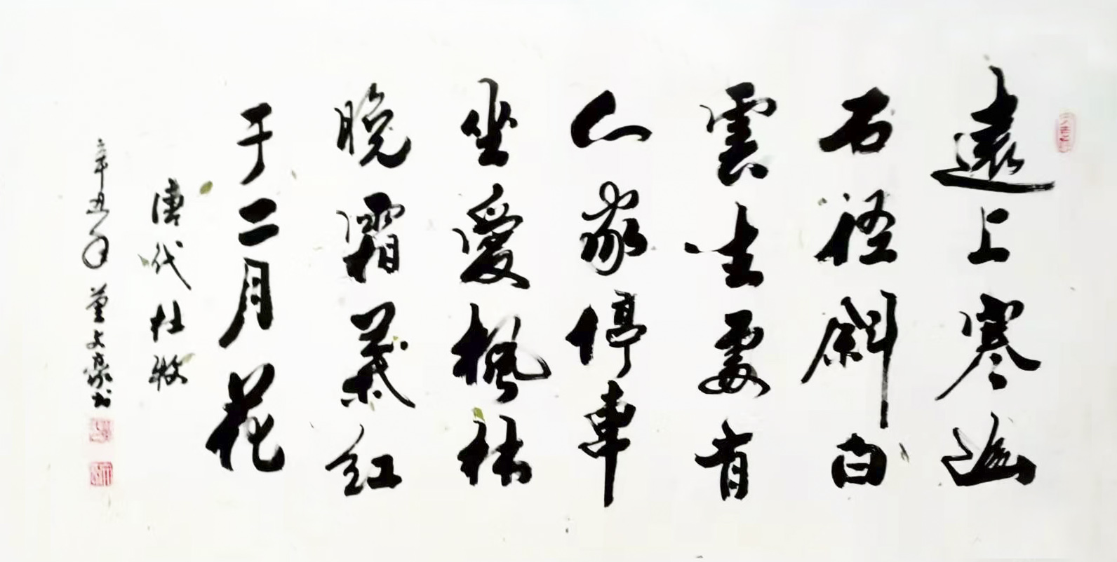 看到董文豪的作品集,图文并茂,书画的格调新颖,他的书法就像是一幅画,使我不忍移目,感慨万千。书画是中国的传统艺术,他的书画就是书画艺术的鲜花。我认识董文豪后,才知道他自幼爱好书法,绘画,多才多艺,他不仅练习楷书,隶书,篆书,绘画更是精妙绝伦,以书入画,对书画勤学苦练博彩重长,不争名不夺利,生活沉迷在书法,绘画之中不能自拔,对于书画有执着和追求完美的精神。由于他有着良好的书写和绘画功夫,广泛爱好的互补、借鉴,可谓落笔生花、墨趣横生,已形成了自己独有的艺术特点和风格。
