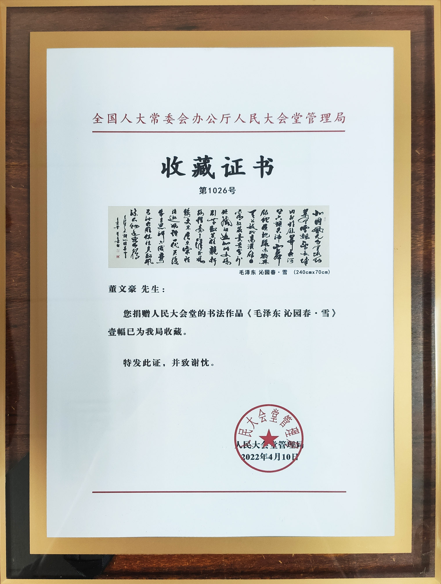 2022年4月10日作品《毛泽东 沁园春·雪》被人民大会堂管理局收藏。