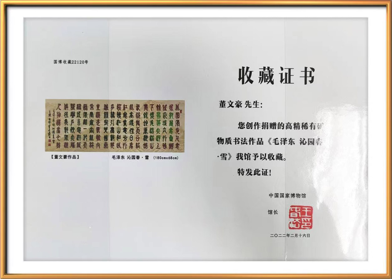 2022年2月16日作品《毛泽东 沁园春·雪》被中国国家博物馆收藏。