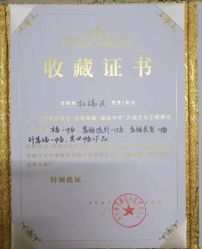 2021年8月1日由广东东华禅寺举办的“百年荣耀,福佑中华”万福文化中四幅作品被文化博物馆收藏。
