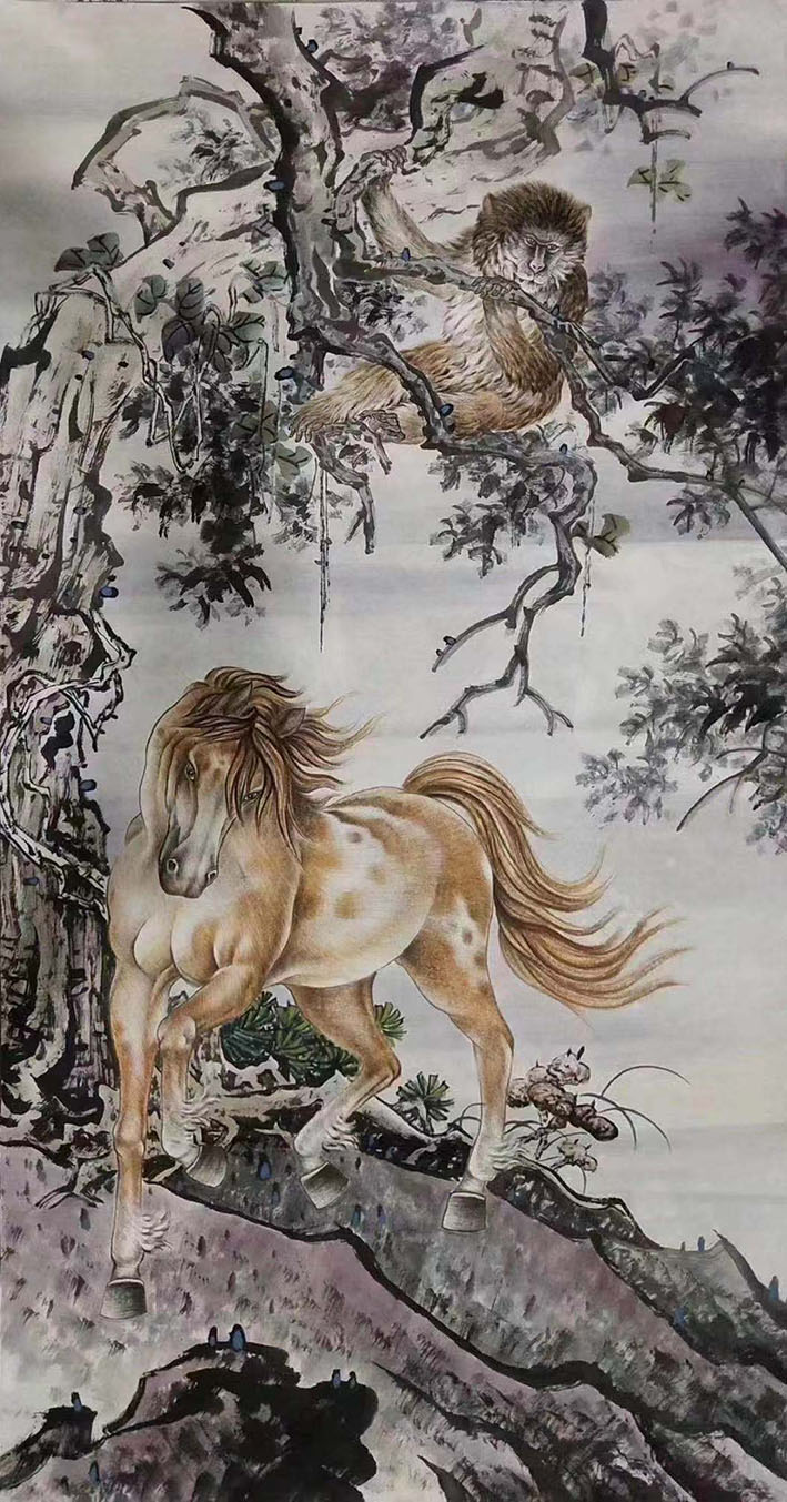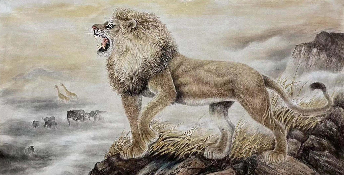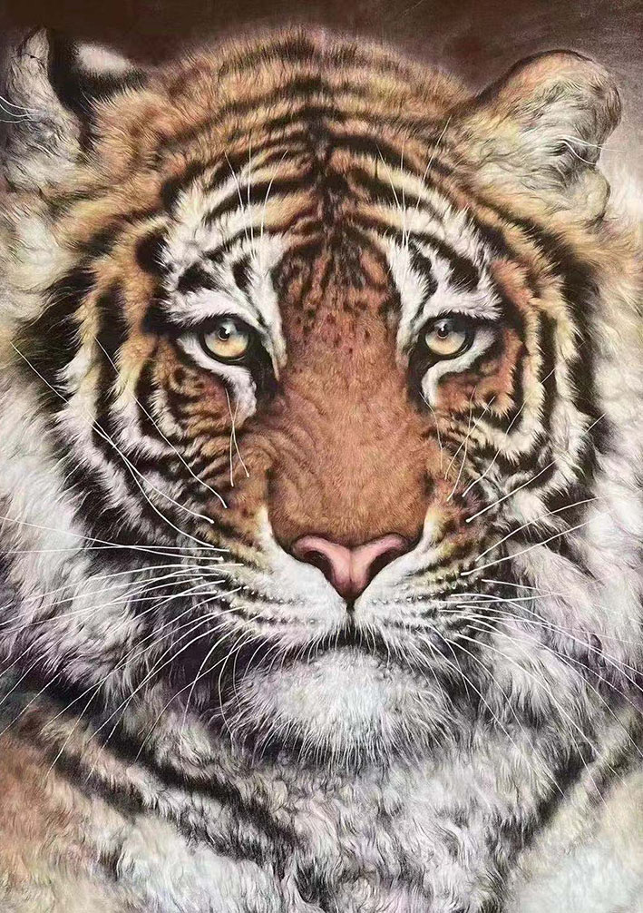 他用中国画的工笔兼写意手法画动物尤擅画虎,他的画受哲学思想和传统文化及国画道法影响深厚,艺术语言独到、个性特色突出、另辟蹊径、独树一帜。其画风简扼率真、自然洒脱、阳刚雄渾、大气凝重、精气神兼备。笔墨随性走质朴、钝拙、老辣、生涩、野逸、狂狷一路,不喜不媚不甜自成一格。