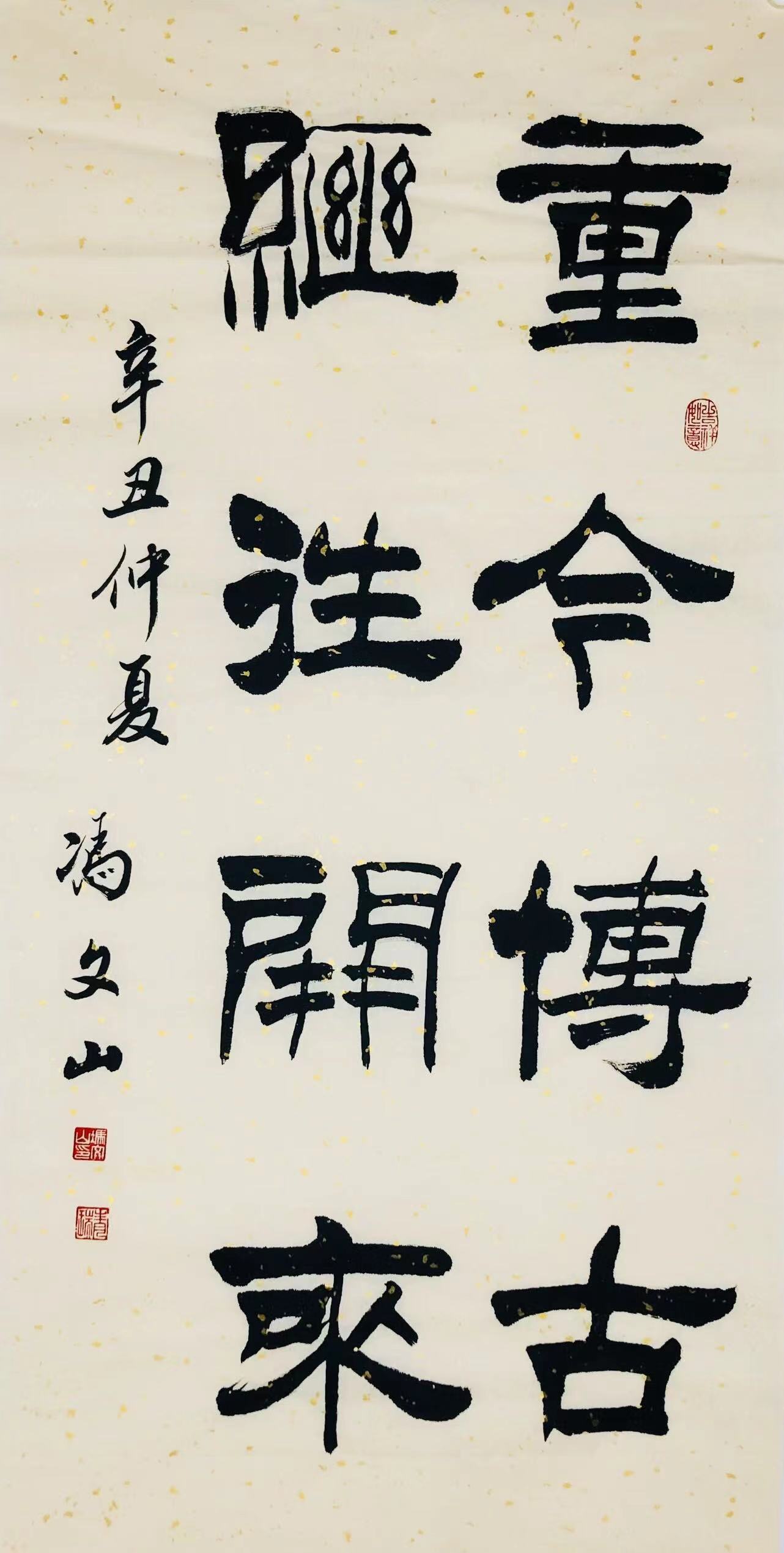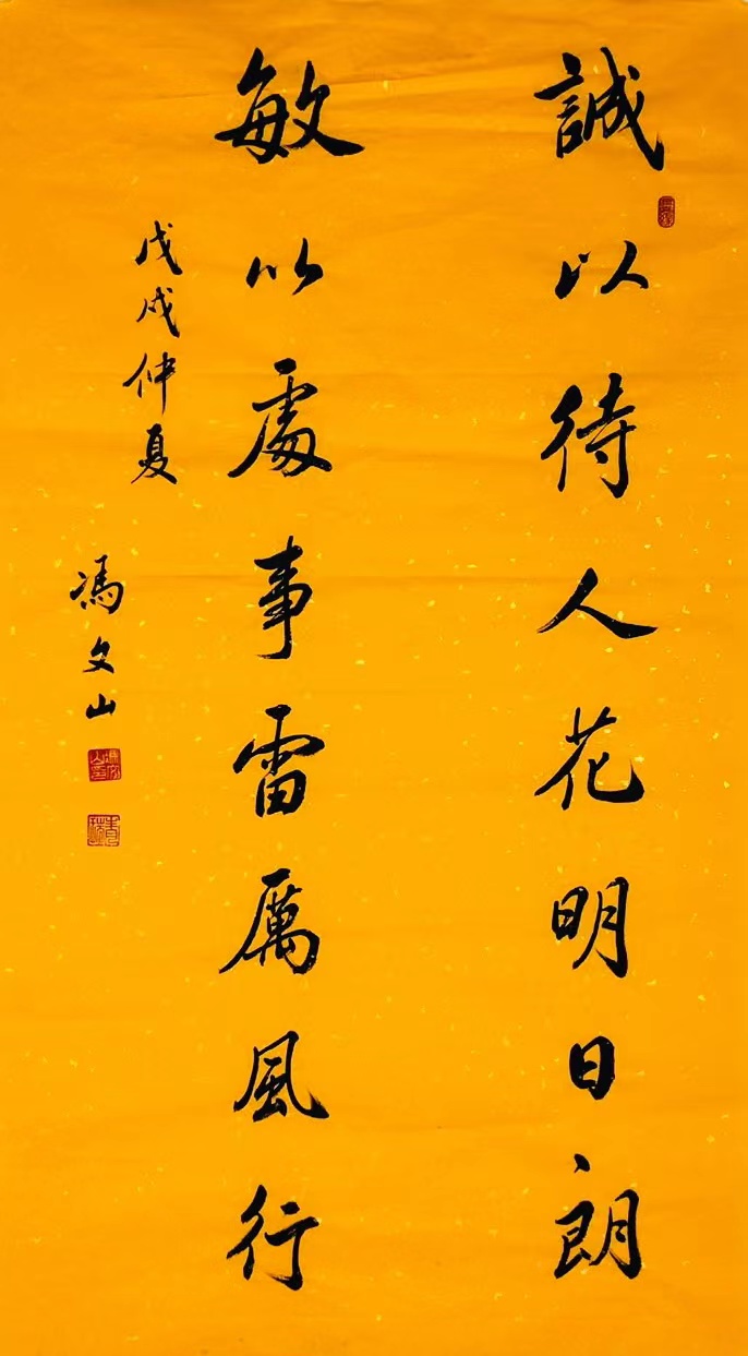 冯文山先生自糼酷爱书画,先受益于民间书法,后临唐碑,尤工欧体。楷书以“率更休”为筋骨,以张即之《金刚经》为神韵,俯仰有致,顿挫得法,隶书遍染汉碑,得《礼器碑》之凝练,《史晨碑》之逸宕,《张迁碑之坚实,最后得趣于《石门颂》之博大、奔放,作品益臻成熟,行书宗大王,触类诸家,追求力度、神韵和形体的和谐合化;所作洒脱秀逸,风度翩然。