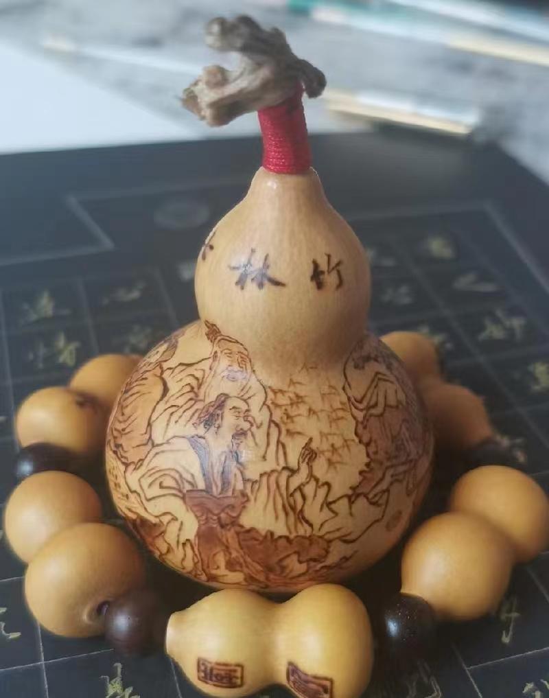 葫芦与“福禄”谐音,民间俗信葫芦能避邪气又象征吉祥,每个成熟的葫芦里葫芦籽众多,让人联想到“子孙万代,繁茂吉祥”,千百年来,葫芦作为一种吉祥物和观赏品,一直受到人们的喜爱和珍藏。李乃家老师以葫芦为纸,以烙铁为笔细细勾勒,无论是写意山水,还是“葫芦墨画” “竹林七贤” “五子登科”等。 通过李乃家老师的葫芦烙画可以看到,这门手艺的传承与创新需要特别扎实的功底。比如烙画中不可或缺的书法,没有多年的艰苦打磨根本无法做到。“在葫芦的曲面上写字、作画,要比平常在平面上难得多。”每一笔勾勒回转,每一笔起承转合,都是创作中面临的难题。整体的意境,局部的渲染,都需要在创作中通盘考虑。李乃家老师已经将这门技艺掌握得炉火纯青。