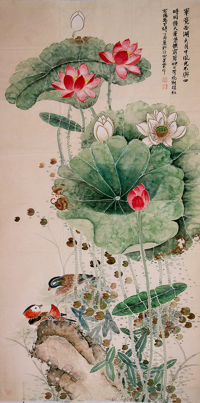 在修练画艺的进程中,田美云着力习描《芥子园画谱》,其作品深受画谱基础技法影响,所以田美云着没骨,笔法合规,墨色切章,师出有门,功力不俗,其国画作品从章法上来看,更得中国画作之要领。比如作品《春艳》构图章法,可称章法奇绝之作。作品左上大幅花盛枝满,以示春临艳涌涌之意,依形造意,形意具得。右下绘突岩一块,突岩所占空间虽小,但其质硬,以硬枯笔造岩势,以势承接上面的满艳之形,可谓是以势承形,柔刚相济,将中国画意境的布局之妙诠释得十分到位。中间置禽,姿态生动,相互顾盼,增加了画面的生命感,富有气息。除此之外,画面大片留白,又显空间大气,意境深远的观感。此作构图章法,并非一日之功,非得画家功底深厚,对中国画境画意有强大理解和把握能力才可施得。