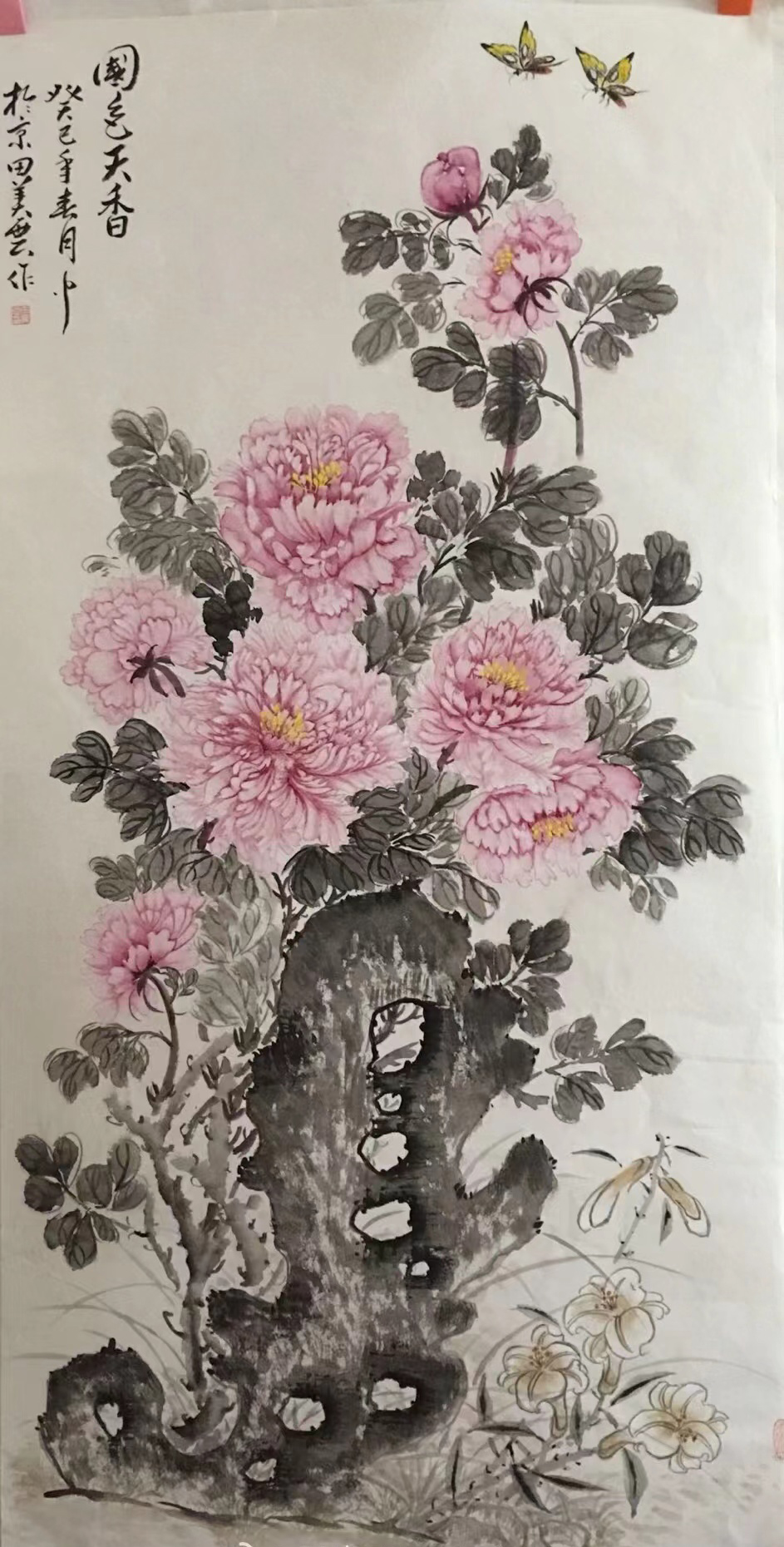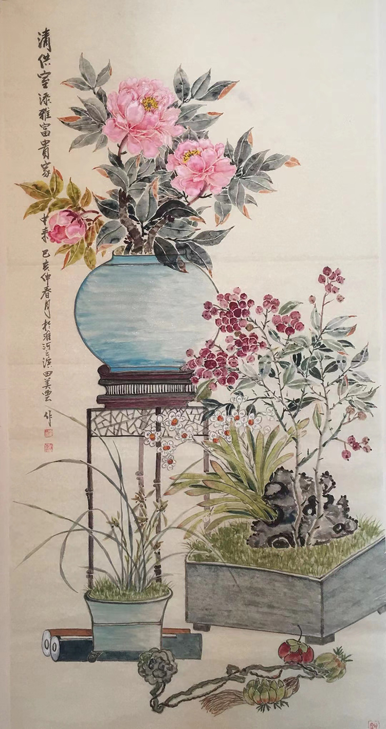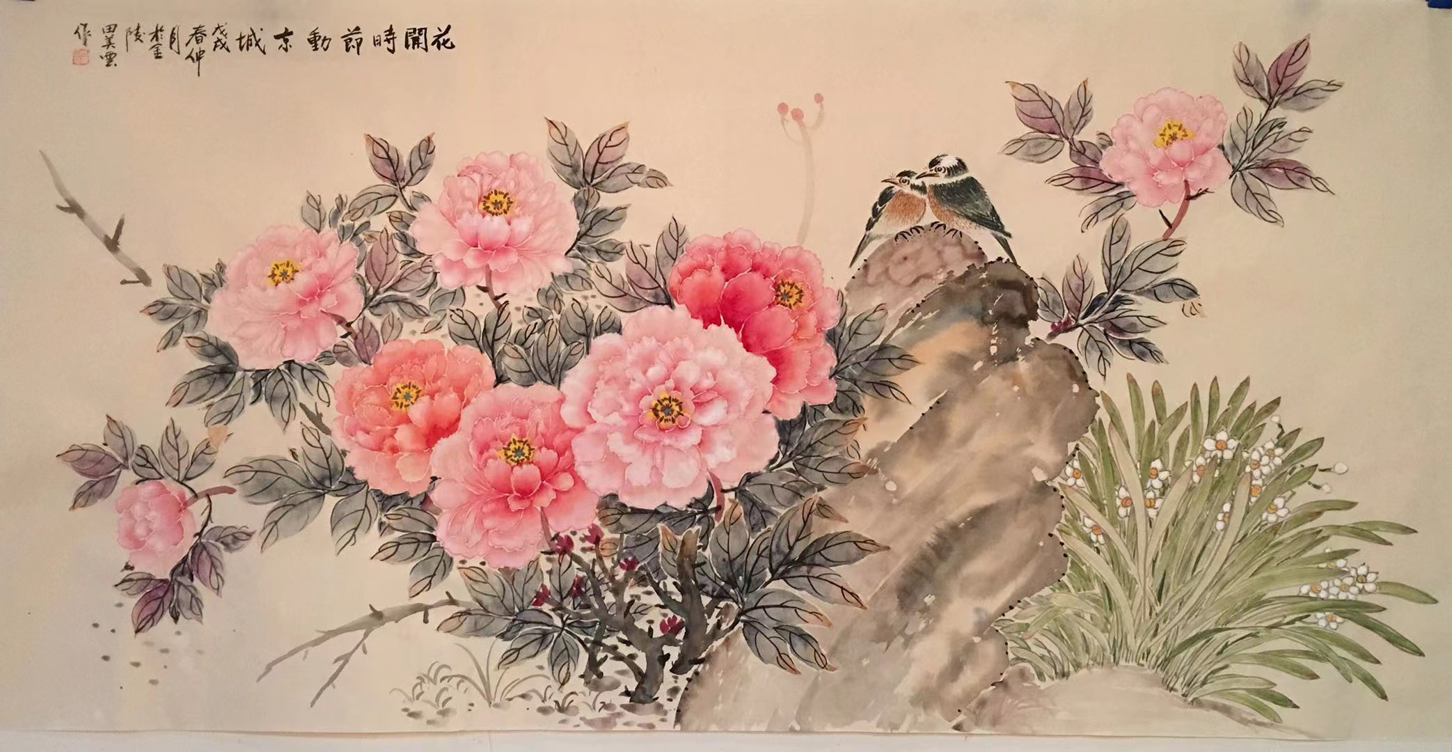 要理解田美云作品的功力,可赏其没骨美作《玉堂富贵》。其作以牡丹、竹、禽入画,意象入境,寓意明白,景致选取,甚得人心。