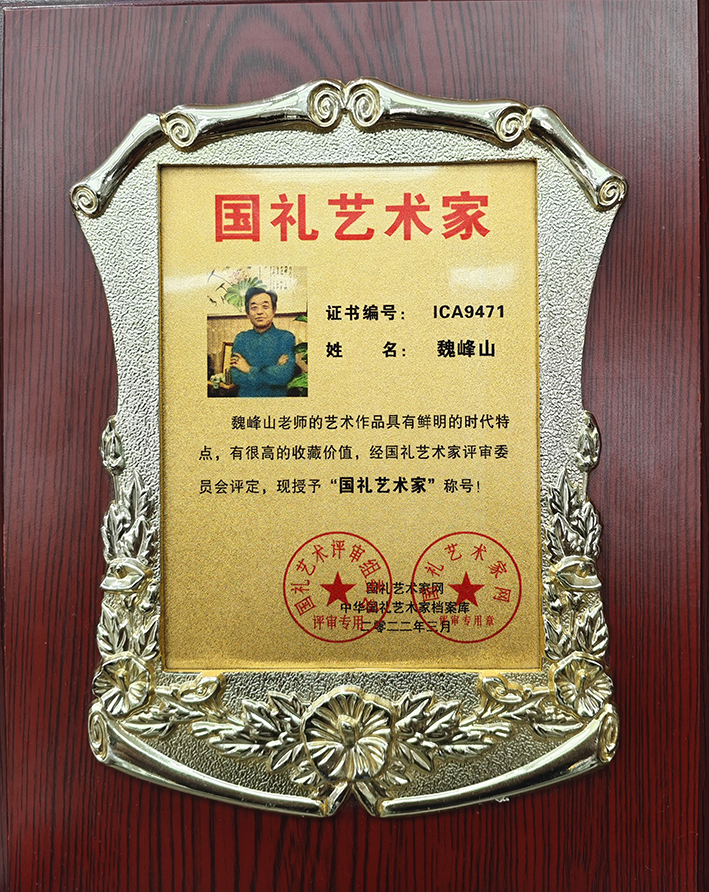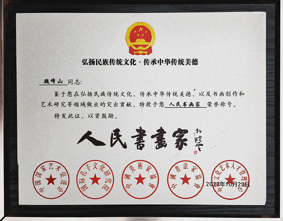 魏峰山,中国篆书创作研究院教授,敦煌莫高窟壁画修复专家,国家一级书法师,国家一级美术师,中国当代百年巨匠,文化部国宾礼特供艺术家,清华美院与中央美院客座教授,中国书法家协会会员,荣宝斋特约艺术家,当代艺术终身成就奖获得者,国家级非物质文化遗产项目古画修复技艺代表性传承人