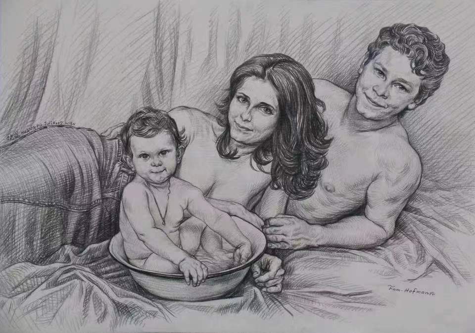 炭笔素描题目改为:《奥地利维也纳木匠幸福一家人》
