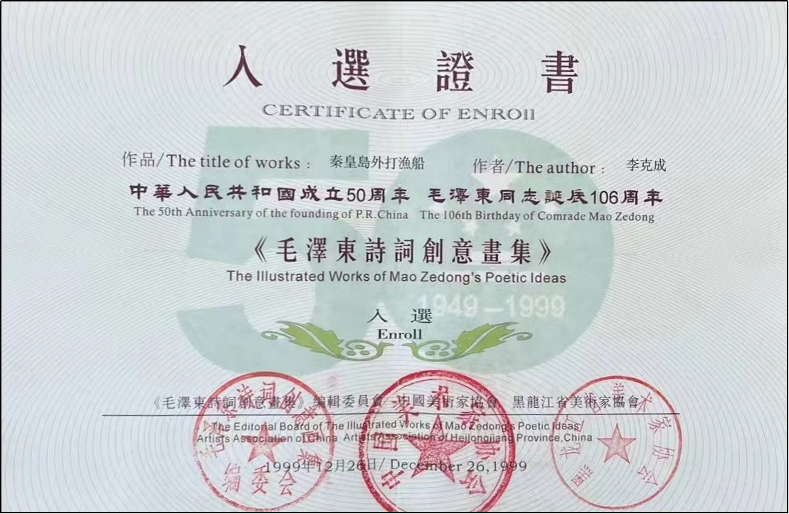 1999年作品《秦皇岛外打渔船》入选建国50周年毛泽东同志诞辰106周年《毛泽东诗词创意画集》