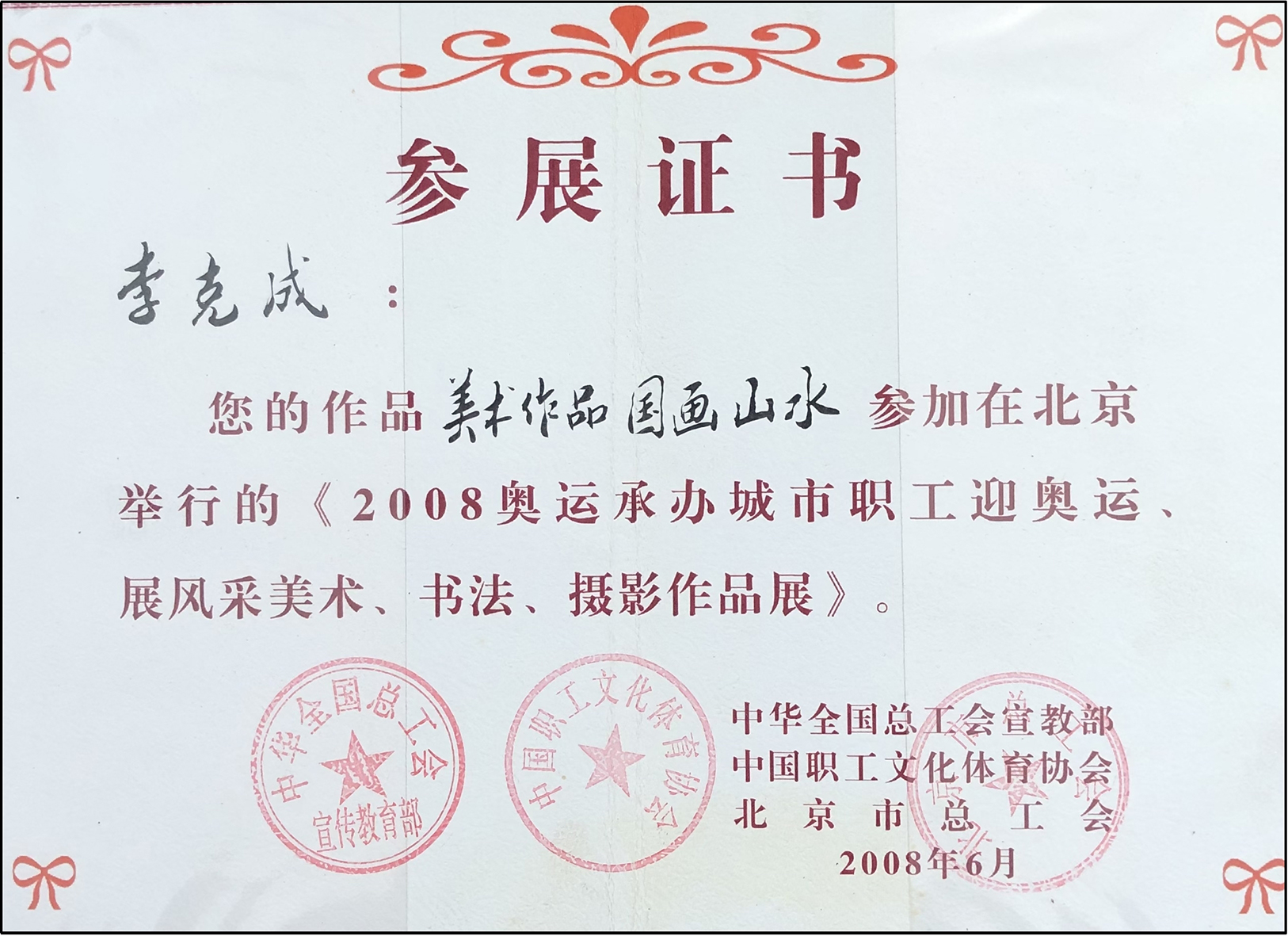 1997年作品荣获第二届职工书画大展二等奖并在中国美术馆展出。