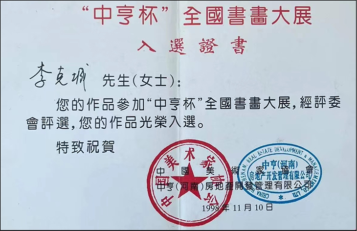 1998年由中国美术家协会主办的《中享杯》全国书画大展中入选参展