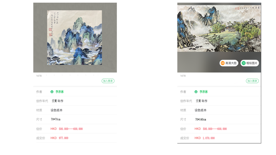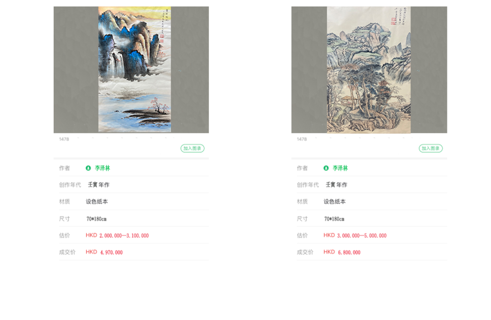 2022年8月6日,李泽林创作的山水 :4平尺的《流云》和8平尺的《富居紫山》分别以97.7万和107万在香港拍卖成交。