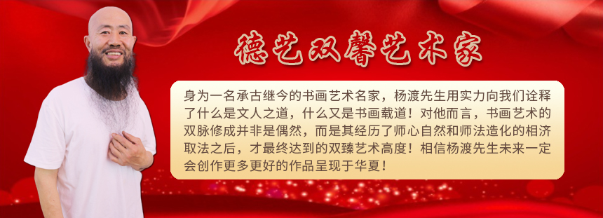 当代实力派书画名家杨渡,1962年生于长春,国家一级书法师,中华国礼艺术家,德艺双馨艺术家。从事书法教育工作及书法艺术创作多年,曾在多个城市举办书法讲座。现为中国书法家协会会员,辽宁省书法家协会会员,中国书法名家联合会会员,中国文化发展促进会理事,中国非物质文化遗产保护联盟书画艺术委员会委员,西安美术学院书法系客座教授。书法作品《天道酬勤》于北京荣之2023盛世收藏春季艺术品拍卖会中国书画专场以45万落槌成交。