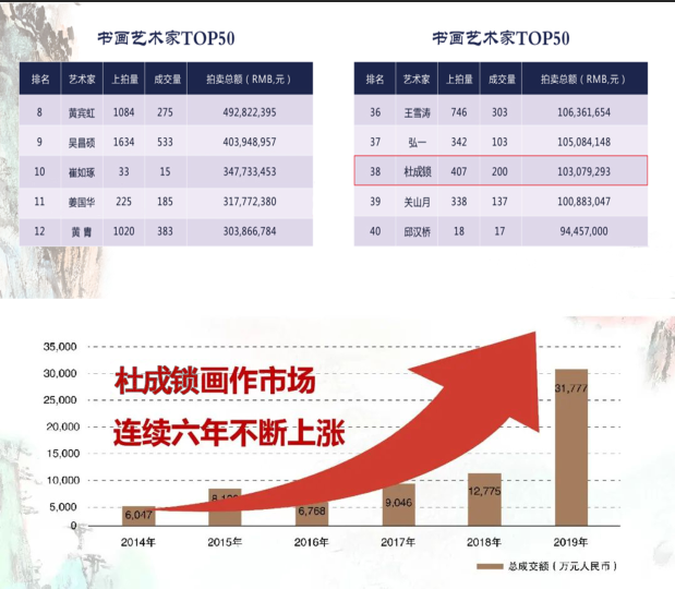 2022年,集结了杜成锁几十年来创作的精品力作,《中国当代名家画集杜成锁》被天津人民美术出版社出版,摘取美术界至 高荣耀桂冠——大红袍,可见其学术地位、艺术成就和影响力均 已得到中国美术界的权威认可和肯定,成为又一位大红袍艺术家,作家市场排名和作品价格连年攀升。