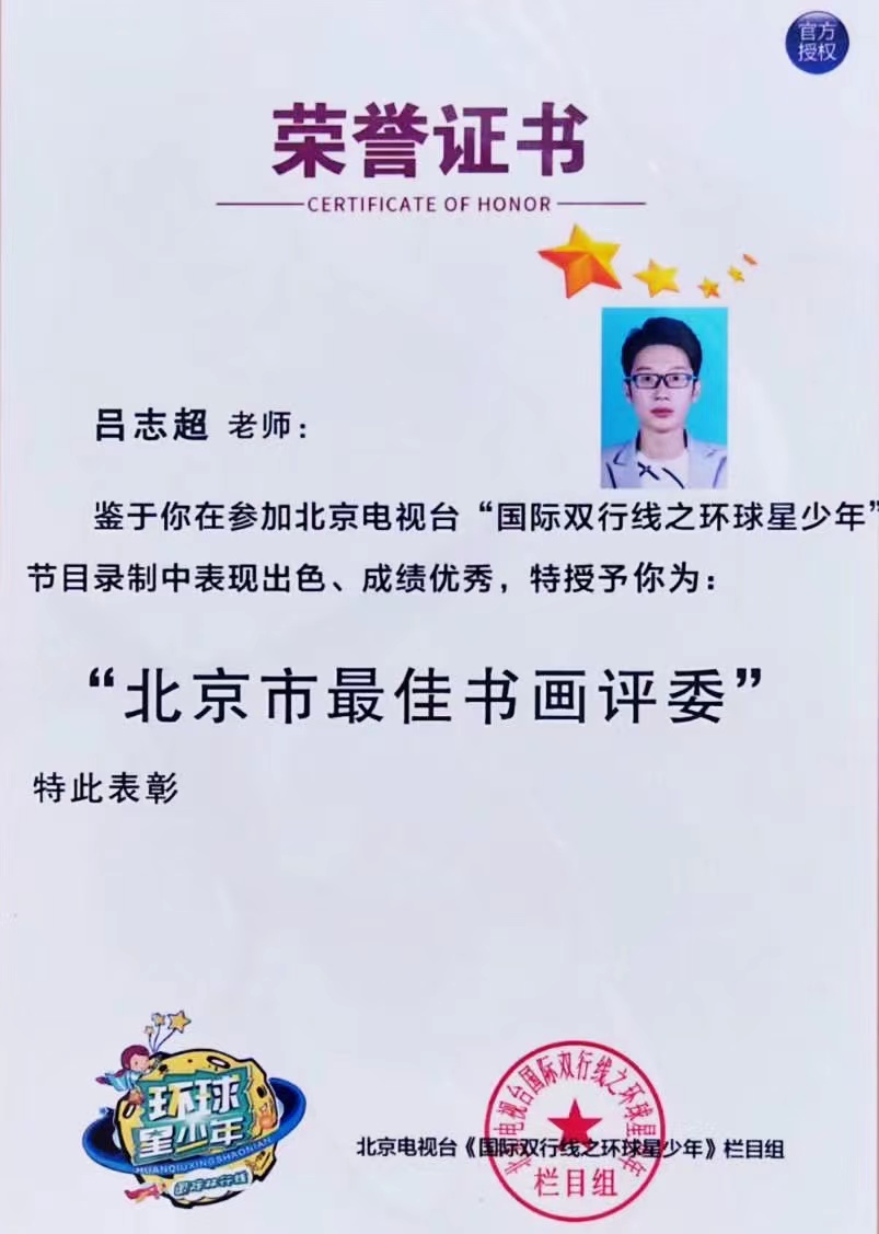 中央电视台“国际双行线之环球星少年”受邀评审,获得“北京市最佳书画评委”;