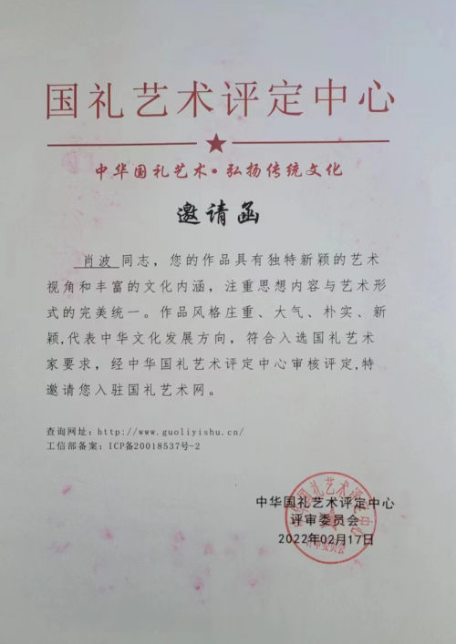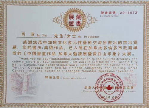 2016年在参加加拿大多伦多市政厅举办的《中国书画作品,加拿大邀请展》中的书法作品,被永久收藏。