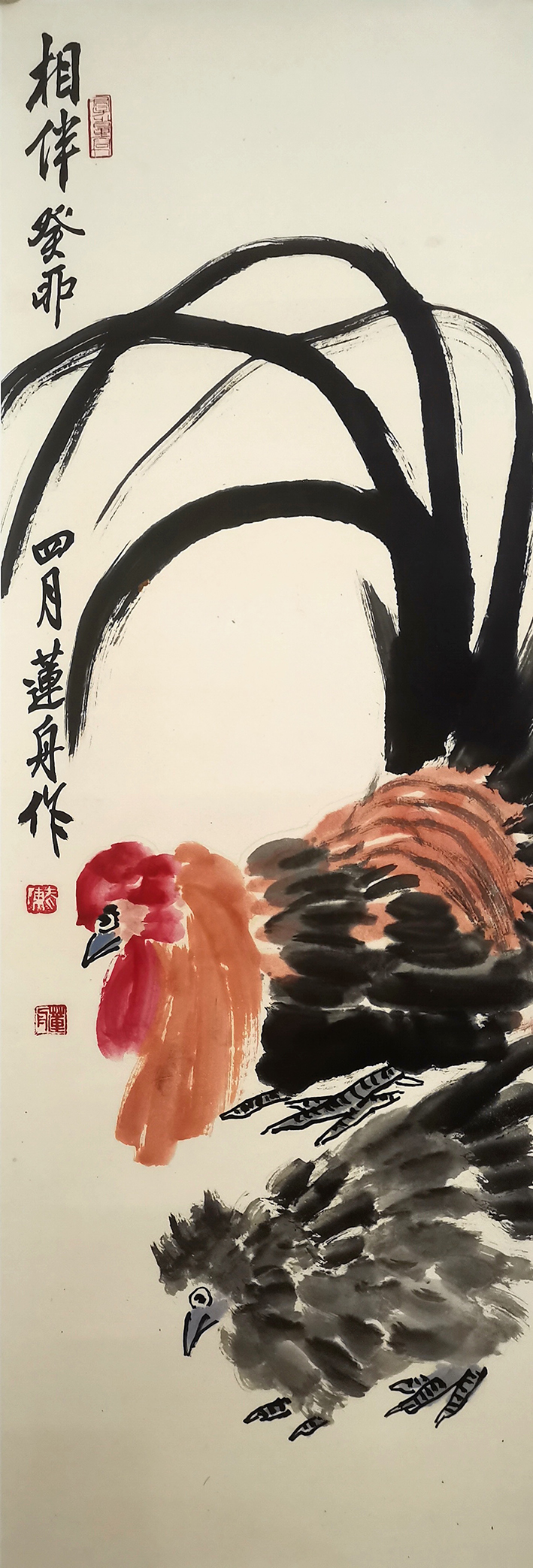 他的花鸟画深得齐派艺术精髓,与当代一些白石传人相比,更具有白石特征,是齐派传人中集大成者、佼佼者,落款相似度也极高,笔墨生动,富有民族气息,他的笔墨语言愈趋雄浑老辣,达到极为自由和纯粹的境界。成为当代画坛为数不多的真正掌握齐派艺术的国画大家。