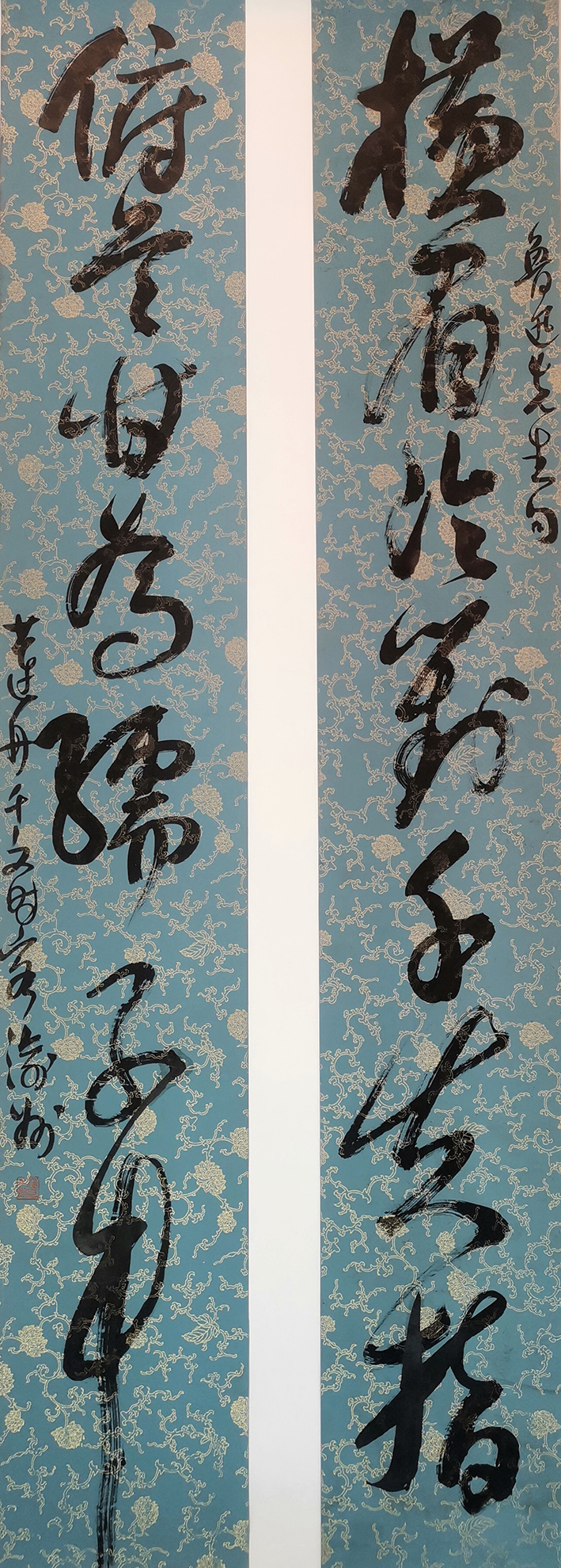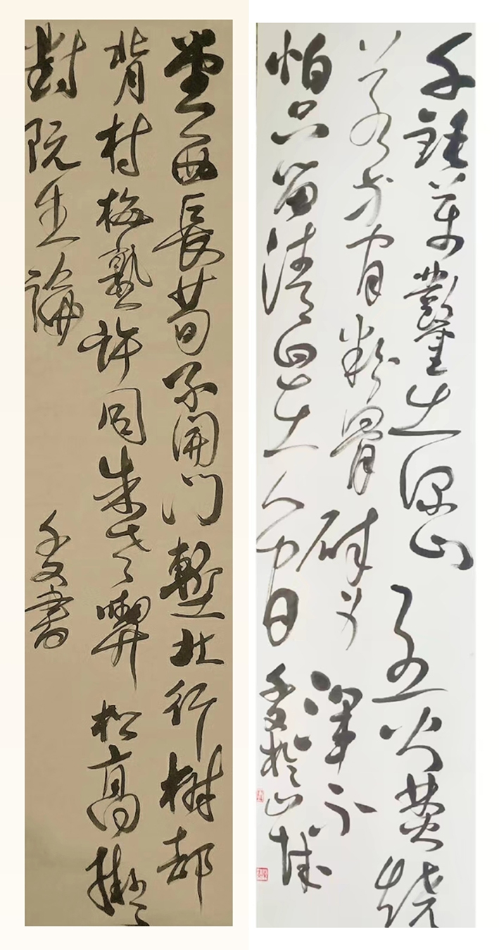 陈先生的草书笔势凌厉迅捷,神完气足,有着怀素狂草笔法的“骤雨旋风,随手万变”之势。作品浑厚潇洒,点画凝炼,顿挫起伏,如千里陈云,气势壮阔,沉着恢宏,苍老雄浑,已达书家晚年人书俱老炉火纯青之势。