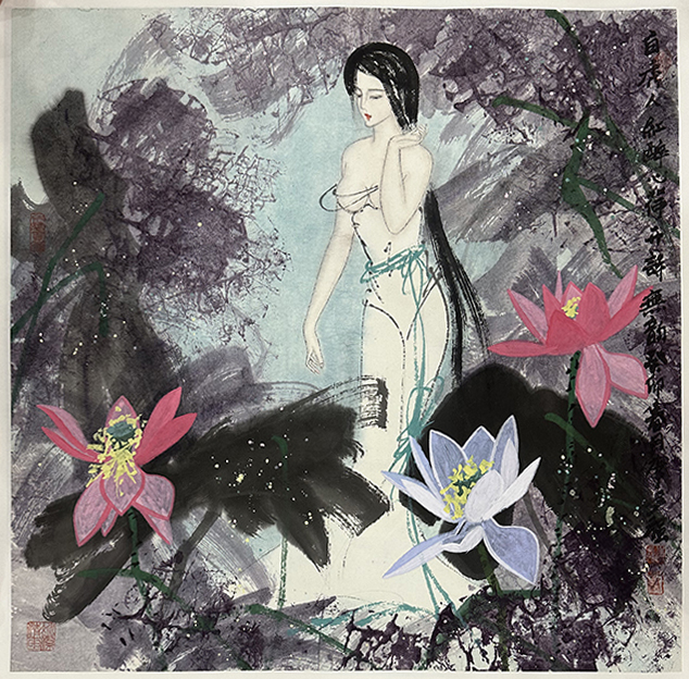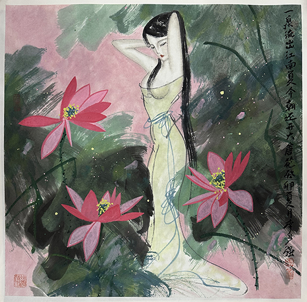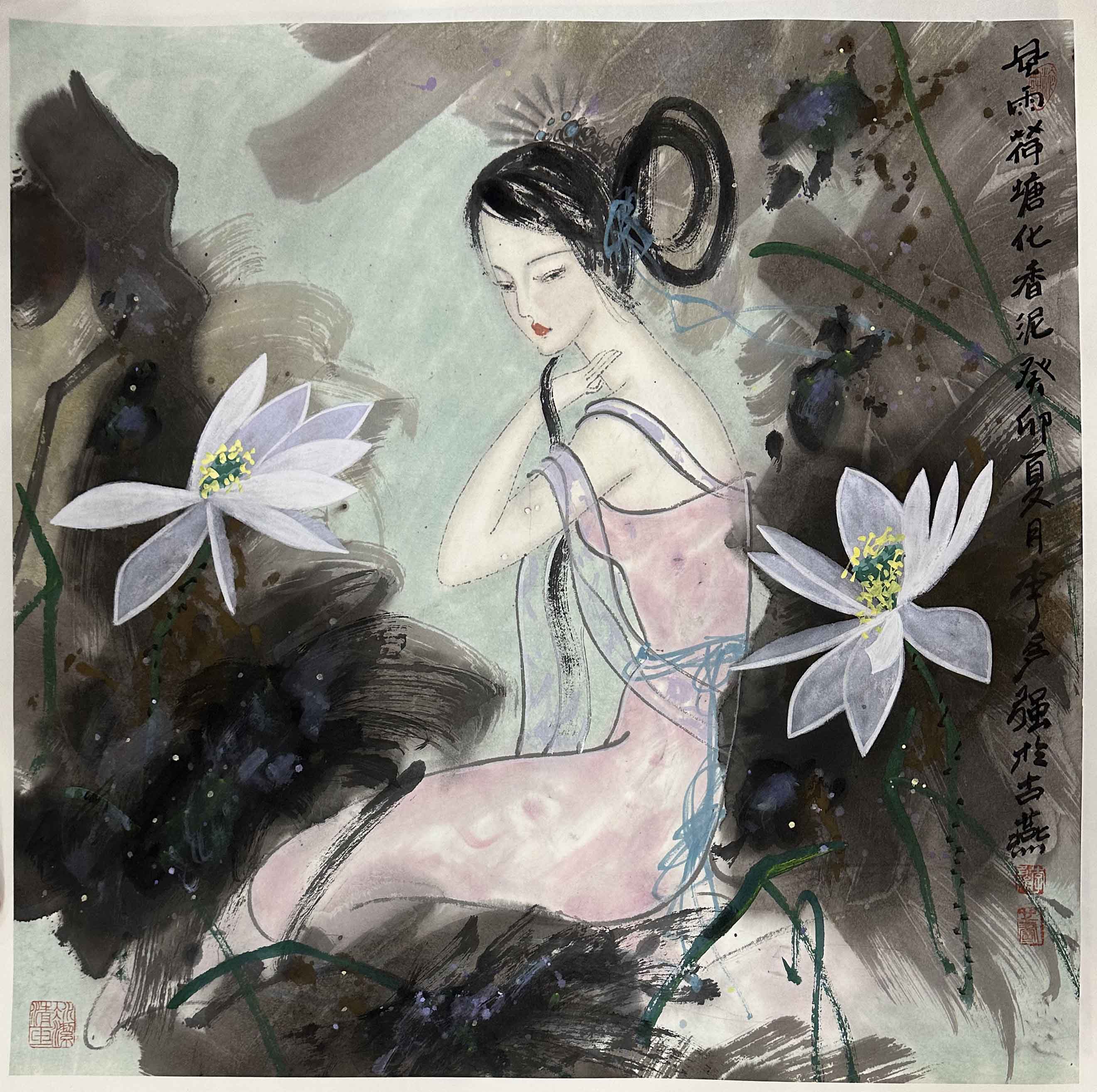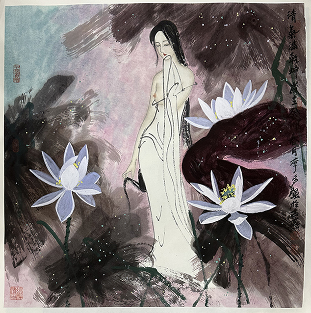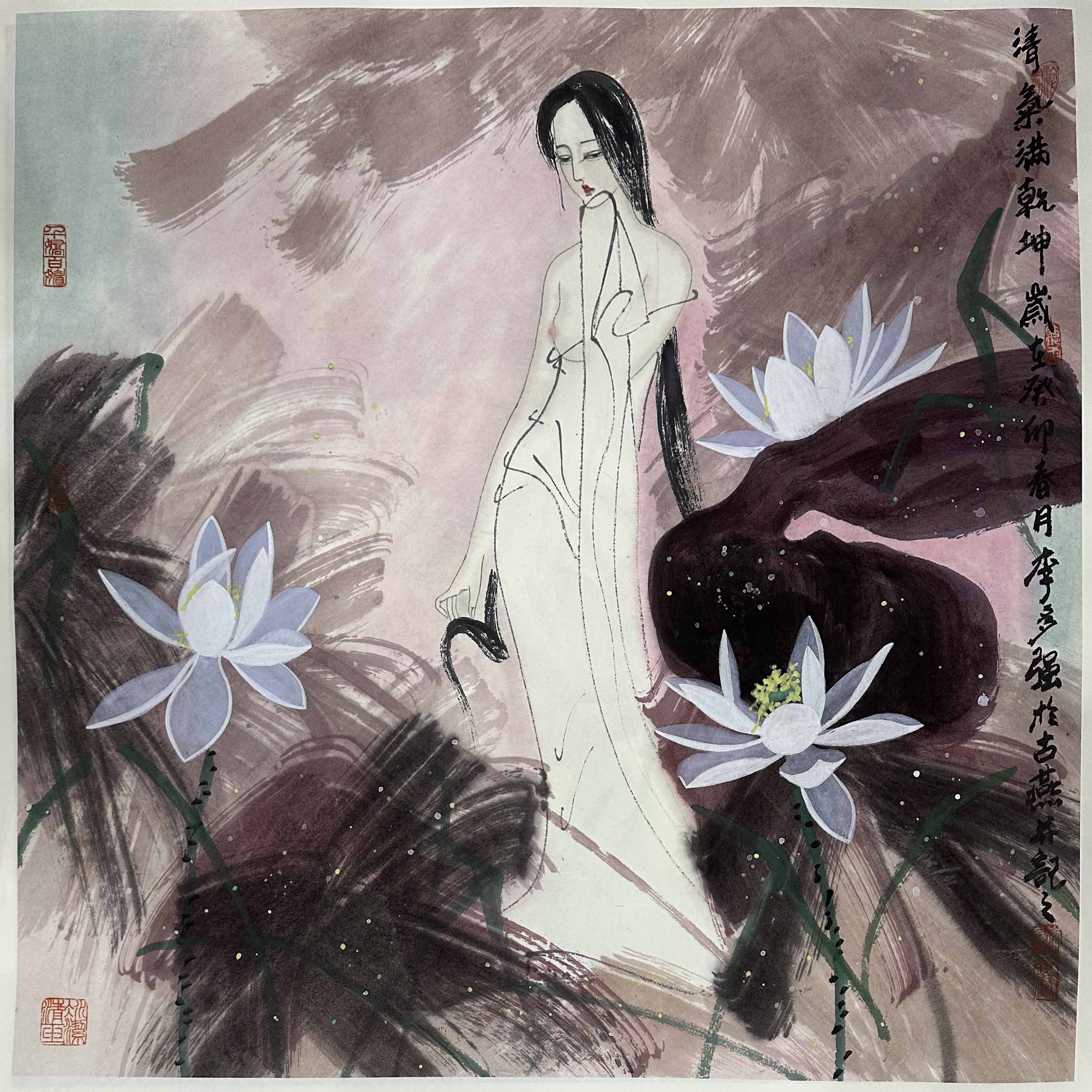 李多强,号诚斋,1958年生,现为北京墨彩画院副院长,京都书画社副社长,卿云诗书画联谊会会员,京津鲁书画联谊会会员,职业画家。多强少年时期极喜爱绘画艺术,1981年正式入中央工艺美术学院(即清华大学美术学院)权正环教授名下学习素描、油画,这为其以后的艺术生涯打下了良好的基础,结业后又开始学习中国画,主攻人物,并受到著名画家阿老、黄均等多位先生指教,1987年正式拜当代人物画名家薛林兴先生为师,从此走上了专职画家的道路。艺术上也有了长足的进步。多强的人物画并非一味的临摹,而是在吸取薛先生的技法同时,又吸收了西画的透视及色彩。以线为主以色为辅,描染并用,使其作品及富立体感。看上去色彩明快,线条柔中带刚,使作品显得非常饱满真实。他笔下的人物多为古今美少女,个个淡雅清新,丽而不妖,具有鲜明的时代气息,深受书画爱好者的喜爱