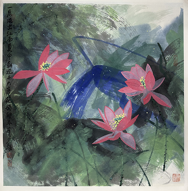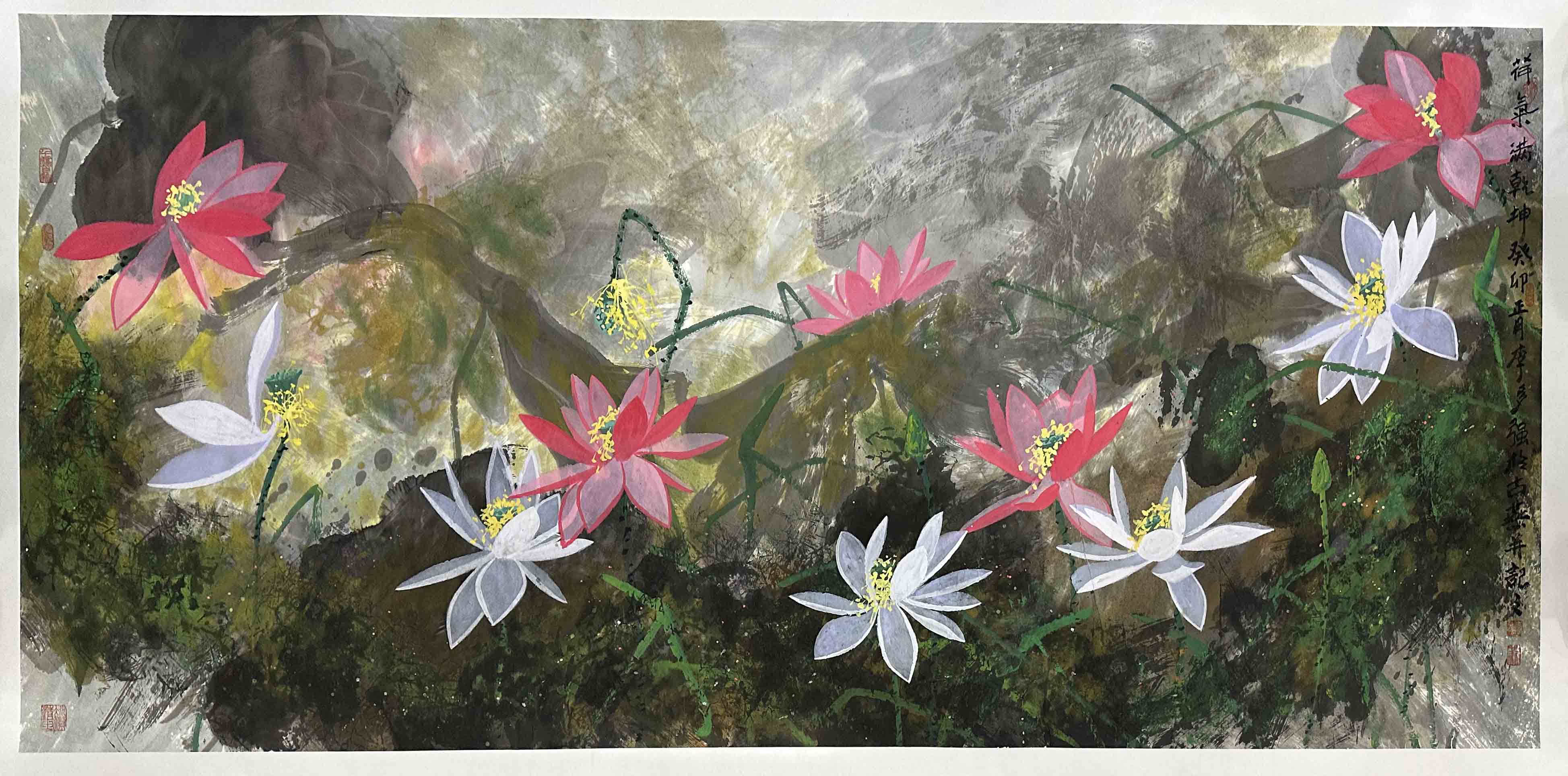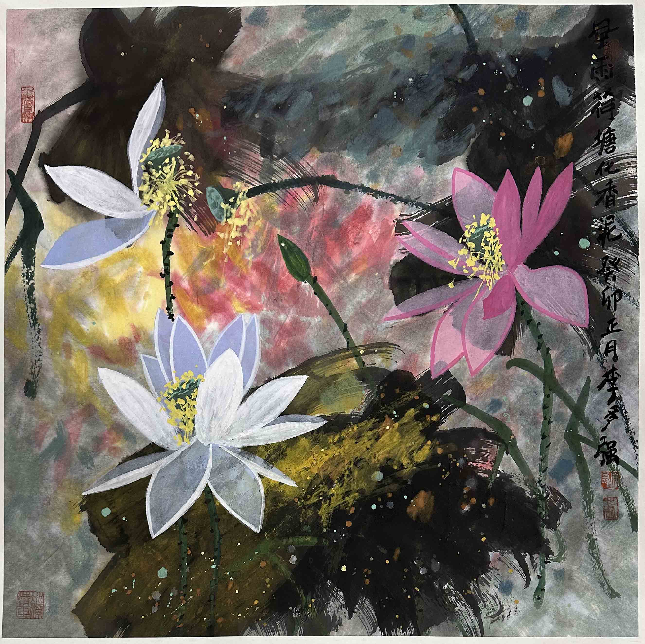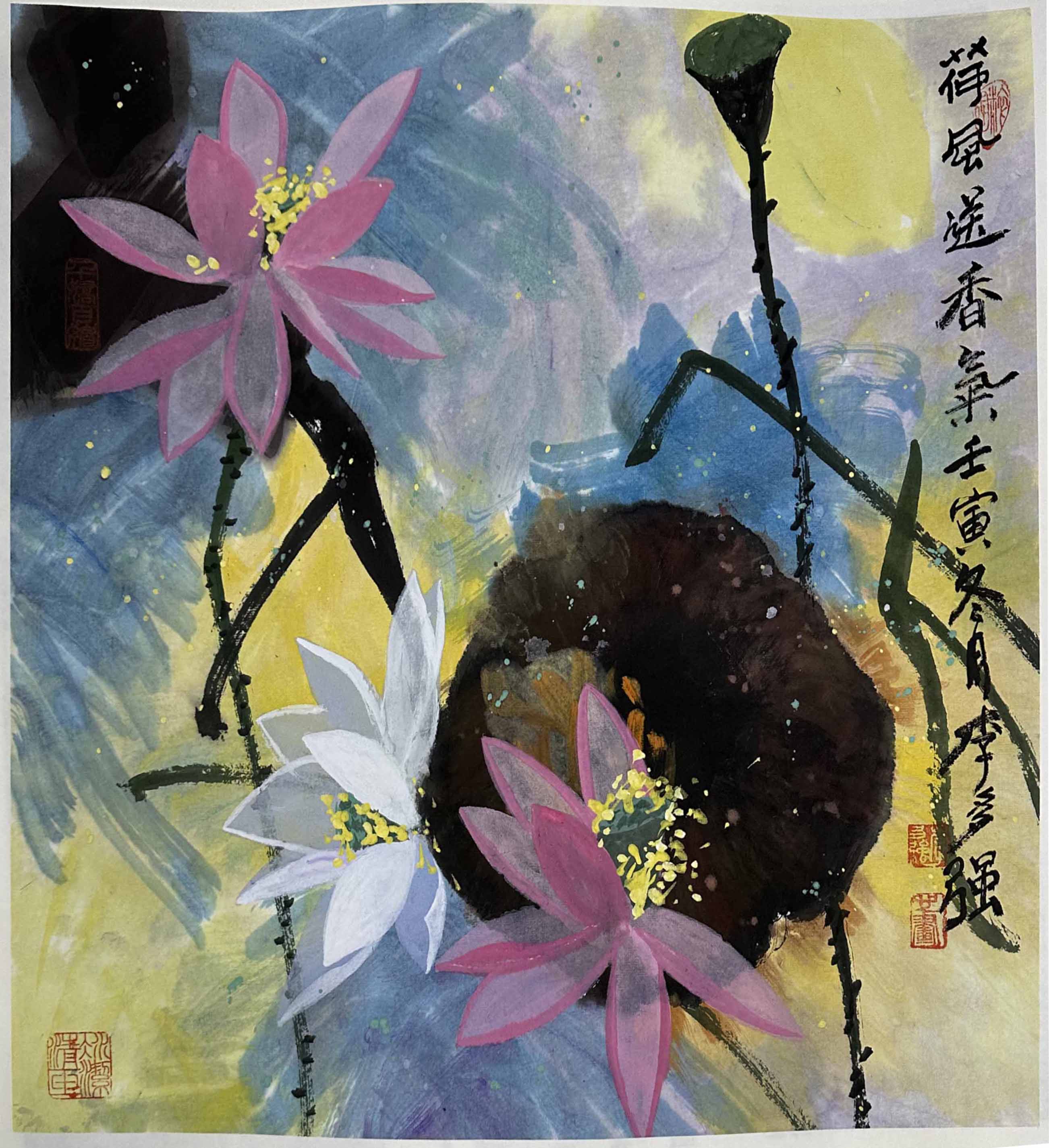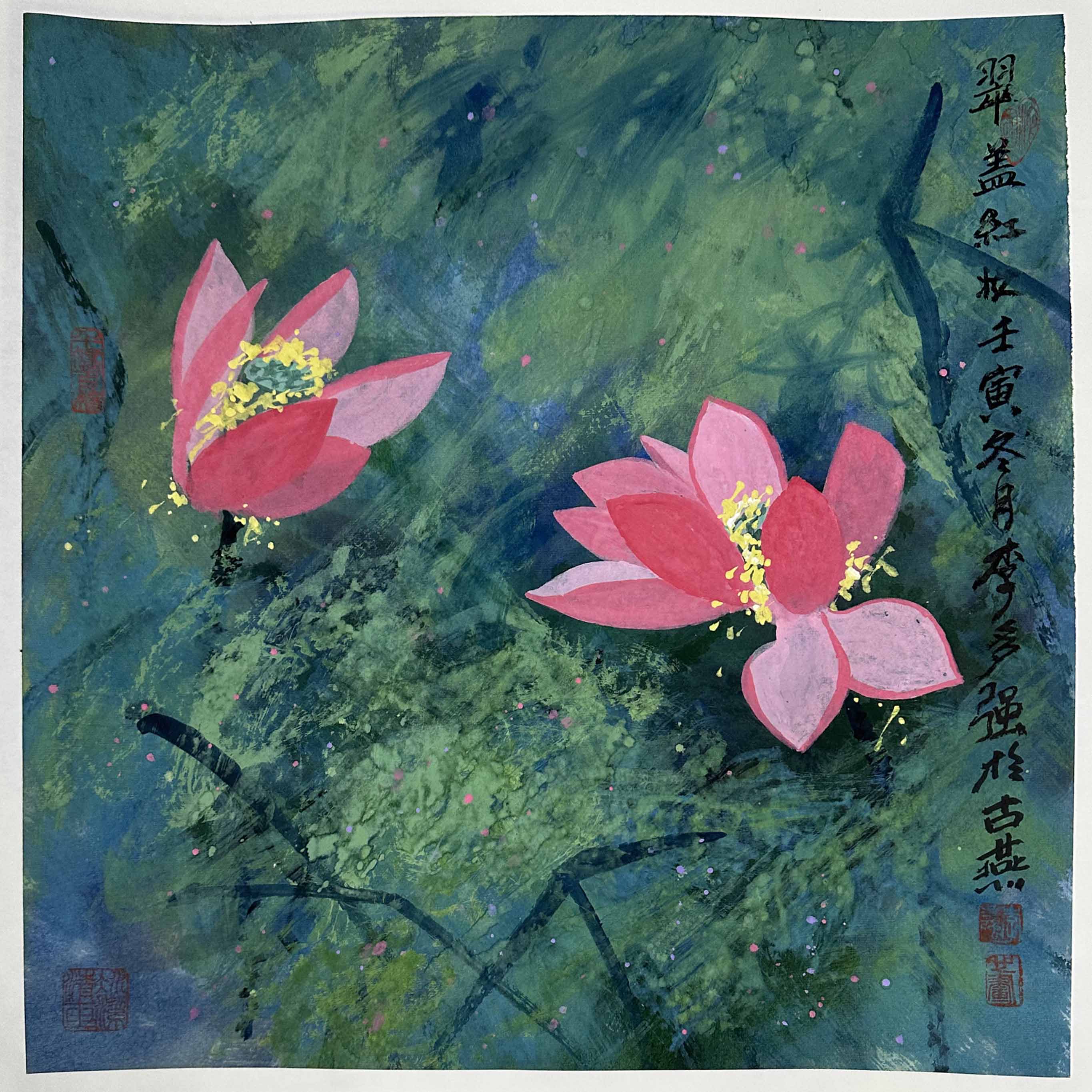 近年来,多强又拓展了画路,把中西合壁的画法,用在花卉的创作上,收到了很好的效果。由其是他的彩荷系列,色调艳丽又不失笔墨情趣,光影透视感非常明显,构图严谨而不拘谨,松阔而不松散,大多一图一景,绝少雷同,受到美术界人士广泛好评。