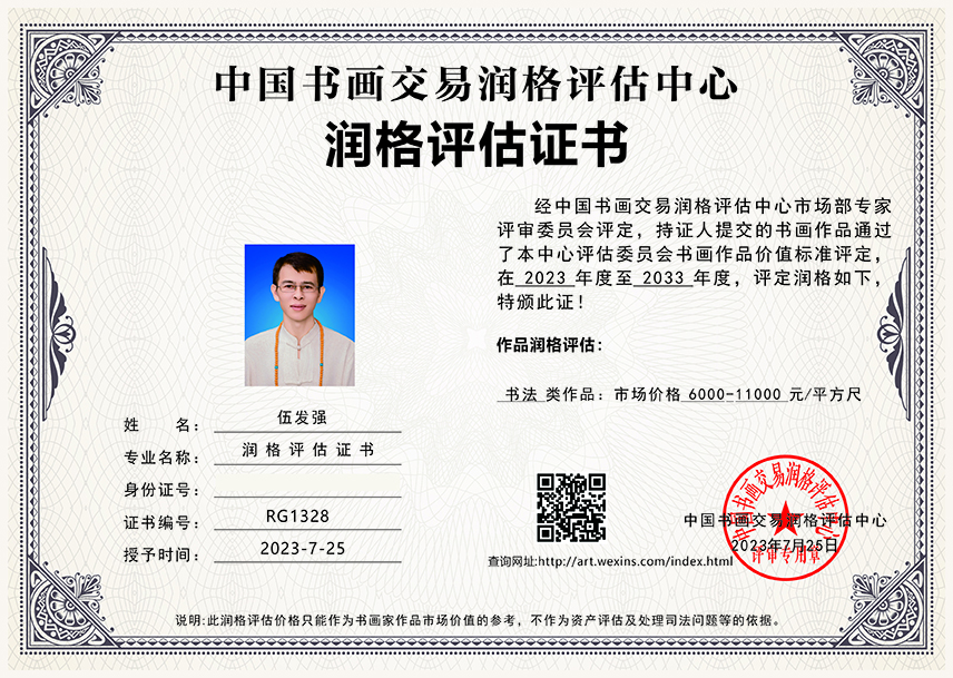 伍发强(1981年生人)广西柳州人士,现居江苏南京。伍发强老师研习书法36年,8岁开始学习书法,经家中长辈启蒙熏陶,后走访名师,临摹碑帖,广交书法界好友,互相交流,书法造诣日臻完善,36年的书法生涯,书写并创作了上千幅个人风格鲜明的作品,他的书法风格刚健有力,以行书和楷书见长。他对书法的探索和创新使得书法艺术更趋向于自由与个性化,伍老师在继承传统书法的同时,且坚持创新,使他的书法作品更趋向于现代人的审美观。伍发强老师的代表作有《九道真言》《紫气东来》《天海》《六道真言》《和为贵》《和财》《和顺》《和家》《鸿业腾飞》《发上等愿》《物华天宝》《前程似锦》《沁园春雪》《天道酬勤》《茶道》《海纳百川》《清平乐六盘山》《山高人为峰》《人生一切靠自己》《立身诚为本》《有志者事竟成》《诚信赢天下》等。