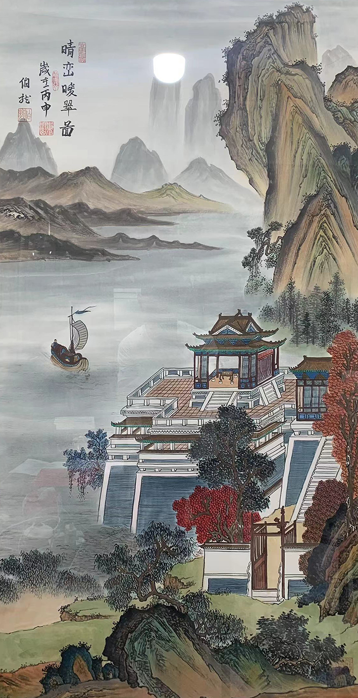 伯龙是宫廷界画《京门画派》掌门人,深受京门画派画风的影响和传统文化熏陶,传统画作尽显郎世宁笔意。现结合写实,风情雨雪,各有神情,树木摇曳之态,乱中有序,动中见静,法度、韵味、气势三者俱佳,时人难及。伯龙的画作对齐白石,陈少梅,溥心畬,吴作人都有涉猎,尤爱陈少梅,溥心畬。是近现代界画绘画史上最具有影响力画家、所绘屋宇楼阁、树木林石,结构精确,自然生动,工整细致,有俊伟奇特之气,尤其“界画”为世人推重。“界画”是随着山水画发展而派生的一科,主要是画与山水画中有关的亭台楼阁、舟船车舆。界画在做画时使用界尺引线,故名界画。界画的创作宗旨就是工整写实,造型准确。界画在唐代几乎成了绘画界的一种時尚。众多画家以工谨、绚丽的笔墨和色彩孜孜不倦地描绘宫苑的华丽和帝王的奢华,界画一直都十分兴盛而在前后延续三百年的宋朝,则由于统治者的提倡和推动,大多数画家都画界画。