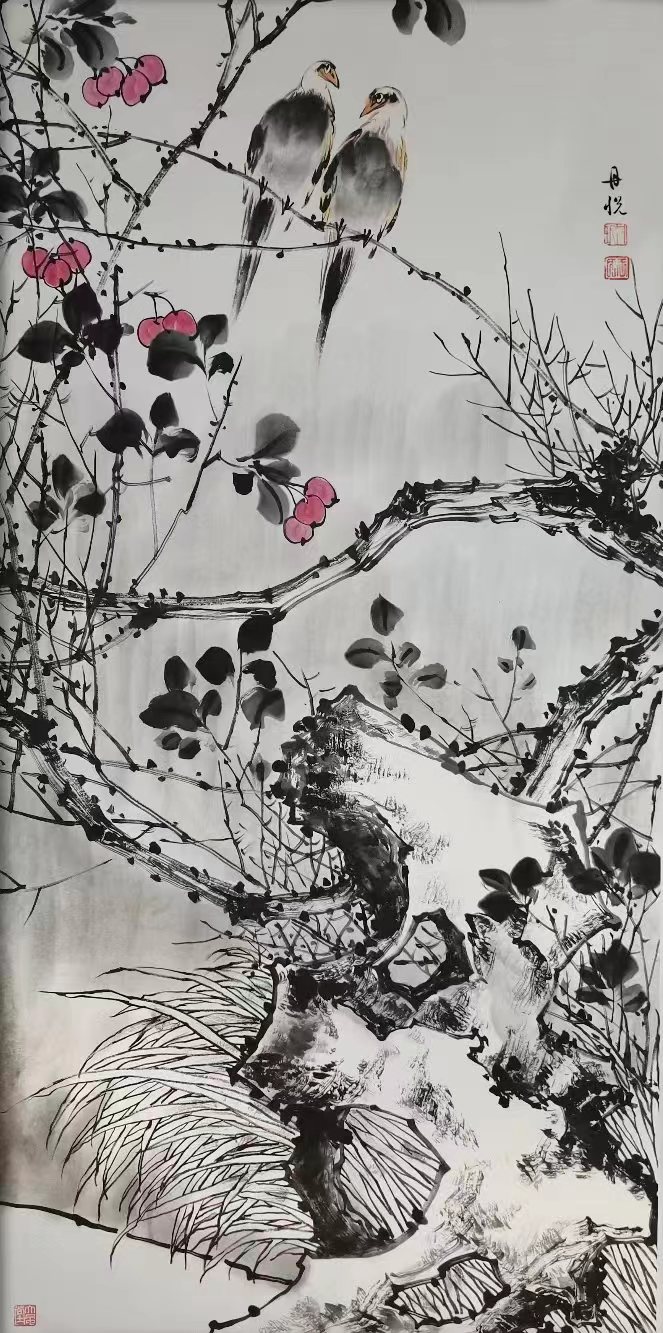 画家对自然一切景物, 都充满深厚的感情。万物有灵,万物生情。自然界中的一山一水、一草一木,既有其形又有其神,画家通过笔墨, 张扬个性, 向观众渲泻自我的感情, 表达的不仅仅是山川林木花鸟之美,更重要的是把自然景物作为抒发和表达人的意念的重要媒介,带着浓郁的感情色彩, 正所谓“草木未必无情”,正道自然。 尊重传统,继承创新,丹悦作品其线得顾恺之,吴道子之精,其形得徐熙,黄荃之态其墨得徐渭,八大山人之韵,其画作又得南齐谢赫六法之妙,形成自家之风别俱一格。
