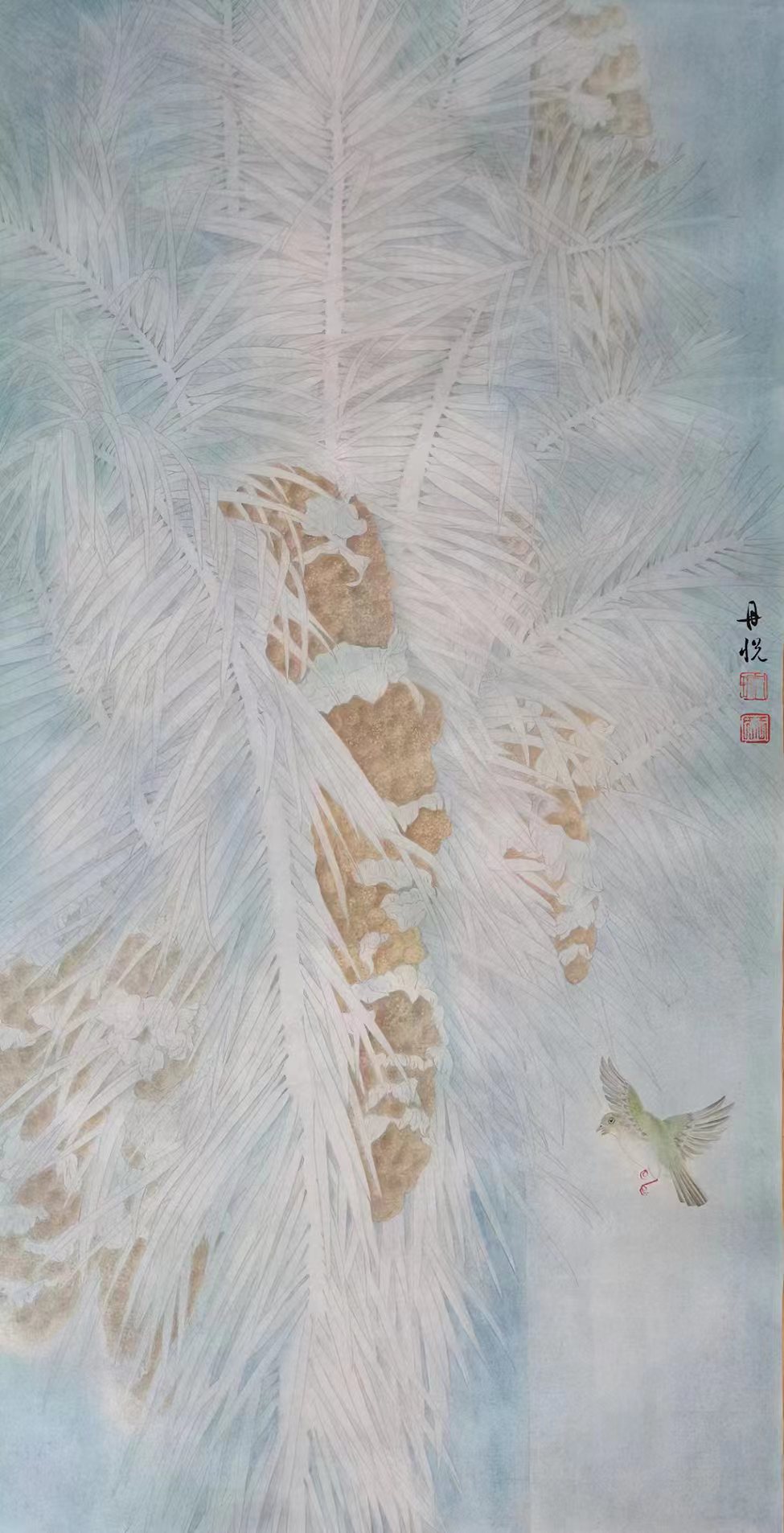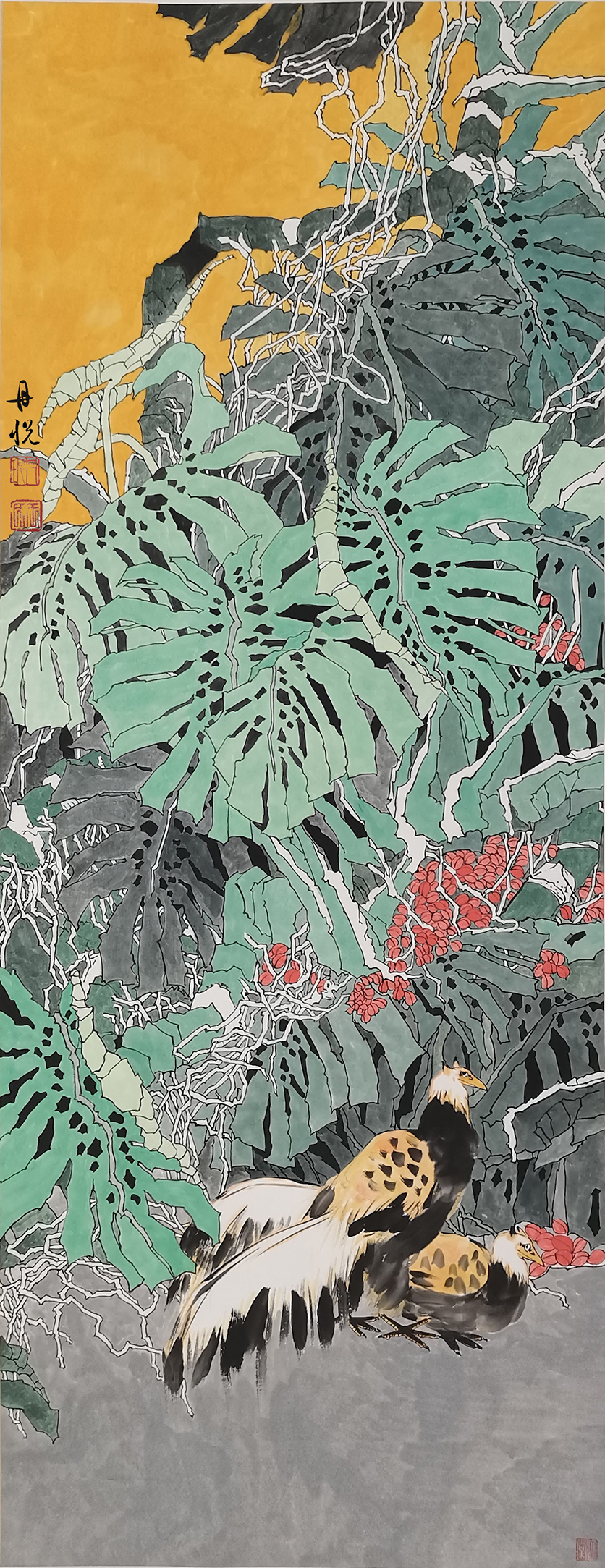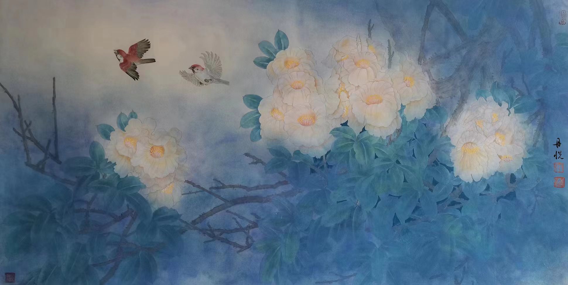 画家丹悦的花鸟画题材比较突出个人风格独特,她的作品形态天然地造有超越时代和现实生活的美感, 凝集着画家的心境和情怀。从画面来看, 可以说是自然的一个定格, 更主要的是抒发作者的思想、对自然的认知,和延绵不绝的生命力。 其精深的美学内涵、风雅的意蕴、玩赏的价值, 以及高度成熟的人文积淀,与现代文明和谐环境渐相溶合。