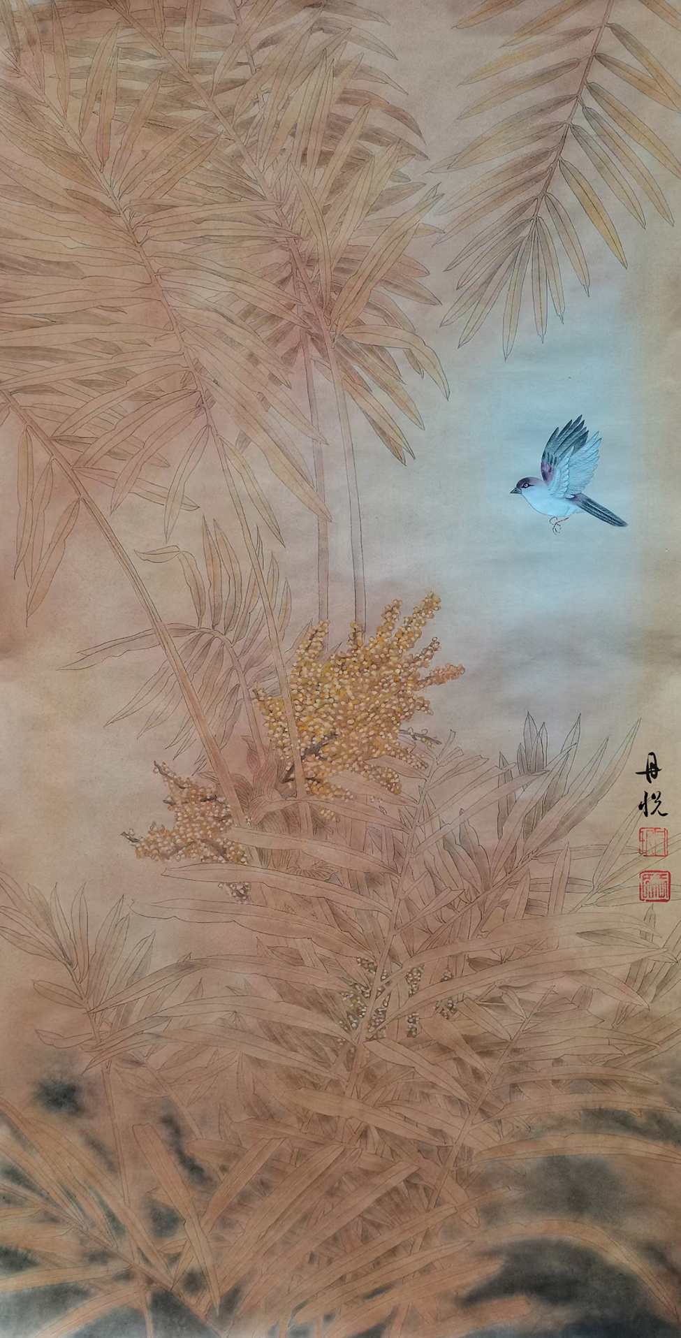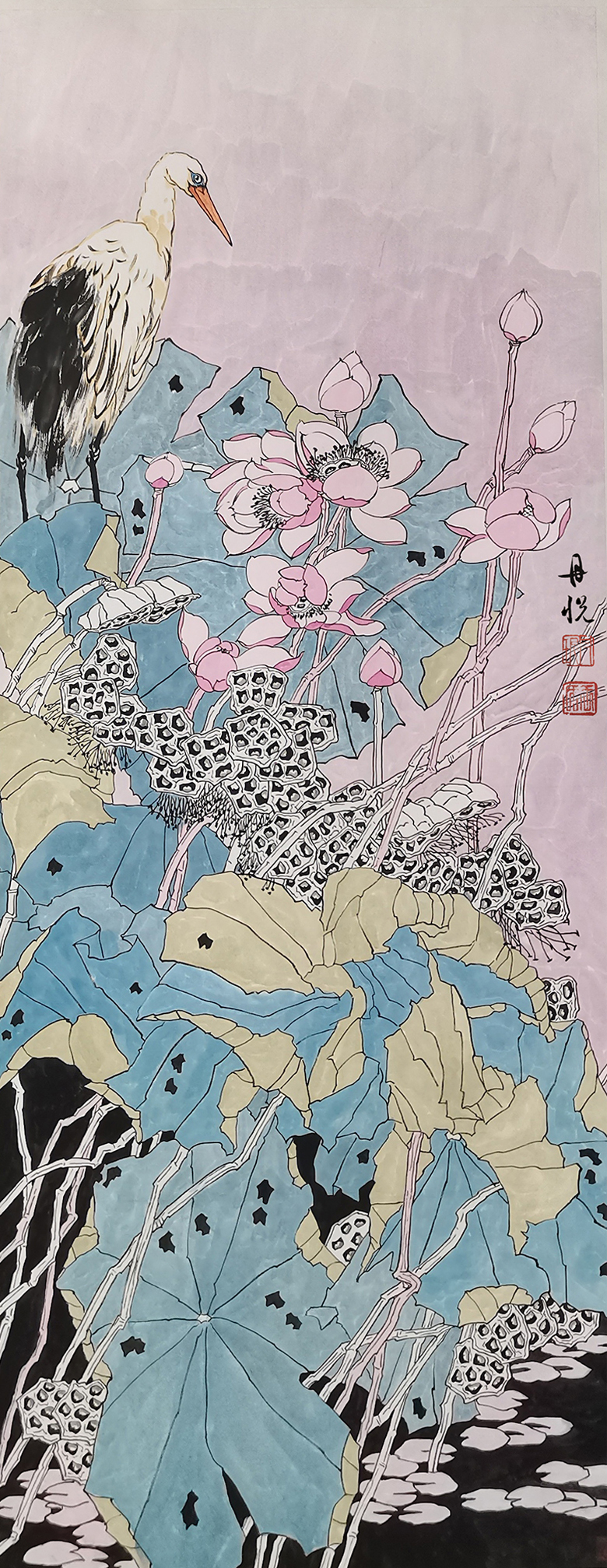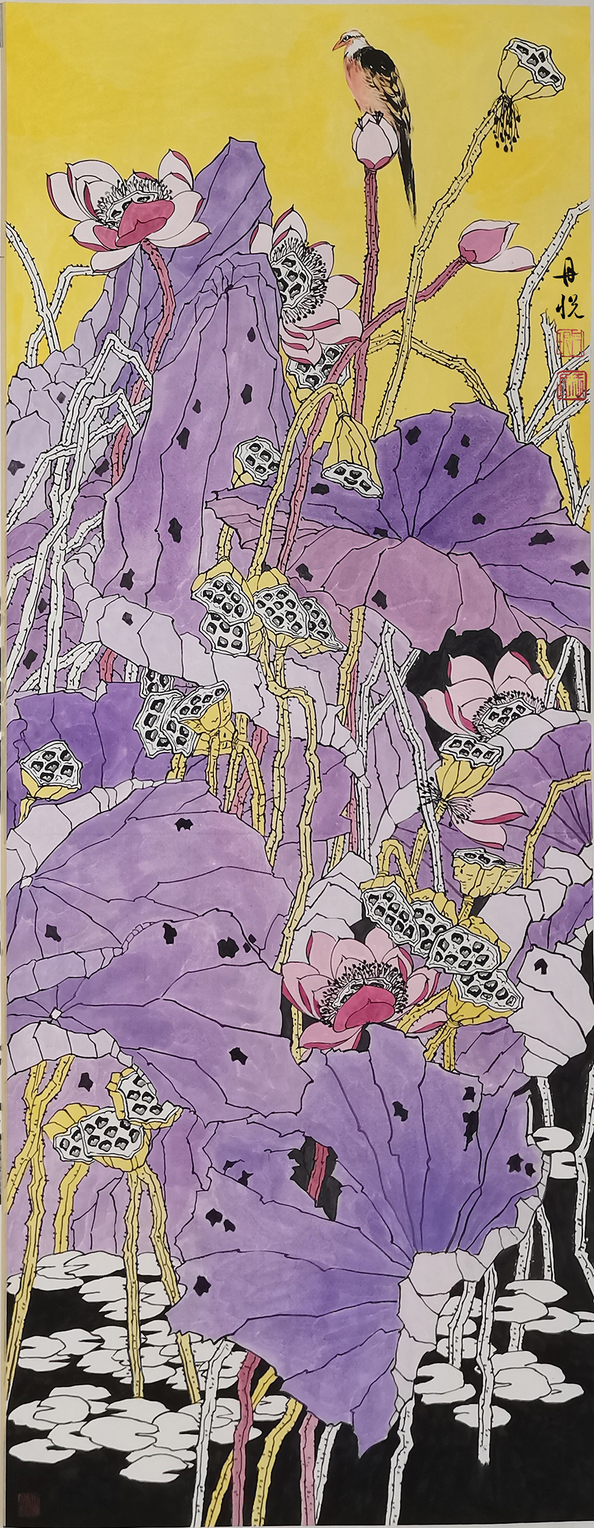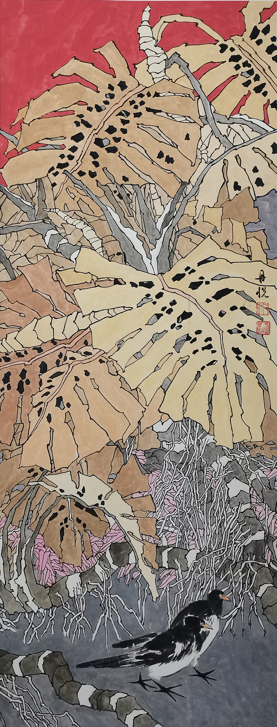 画家丹悦的花鸟画题材比较突出个人风格独特,她的作品形态天然地造有超越时代和现实生活的美感, 凝集着画家的心境和情怀。从画面来看, 可以说是自然的一个定格, 更主要的是抒发作者的思想、对自然的认知,和延绵不绝的生命力。 其精深的美学内涵、风雅的意蕴、玩赏的价值, 以及高度成熟的人文积淀,与现代文明和谐环境渐相溶合。