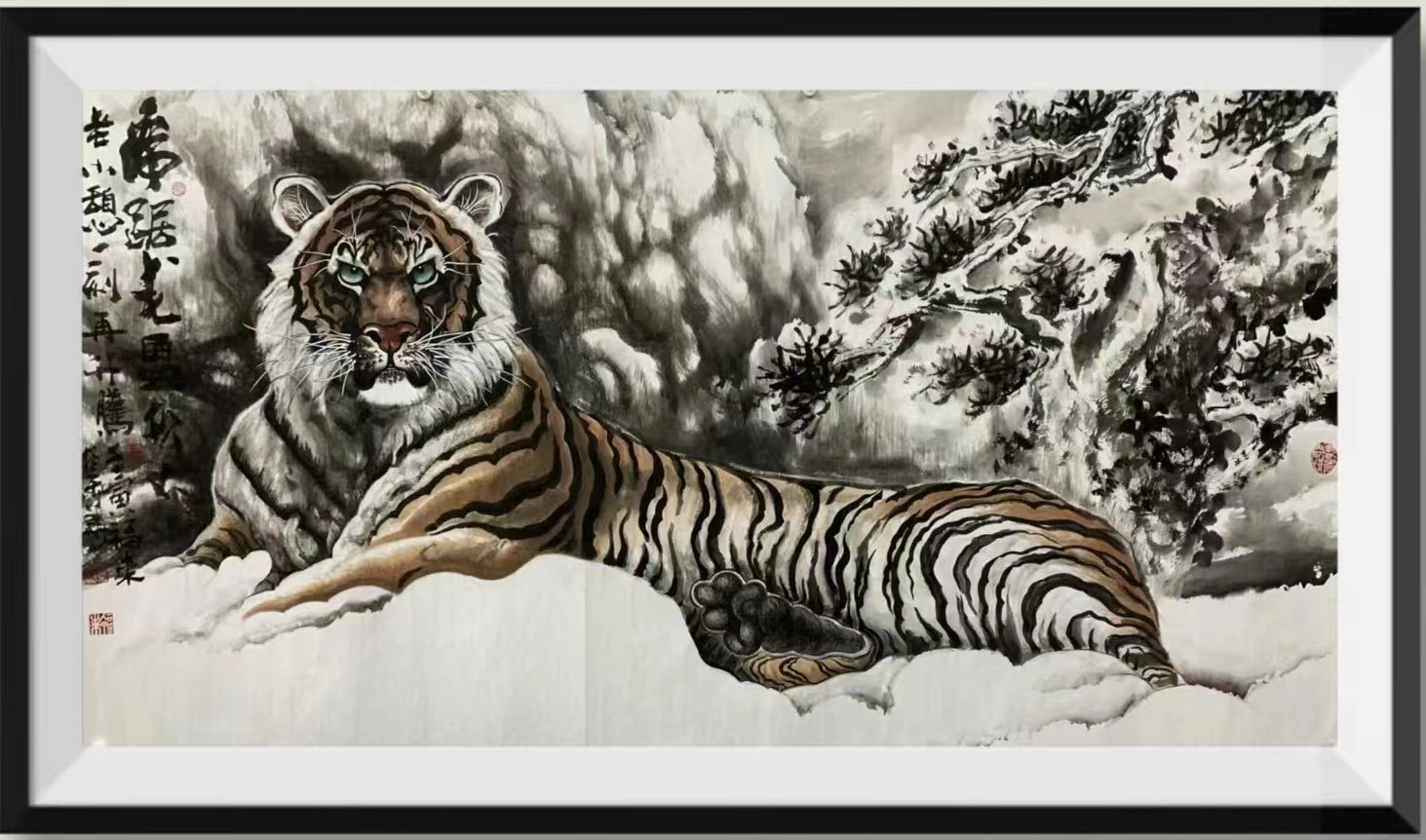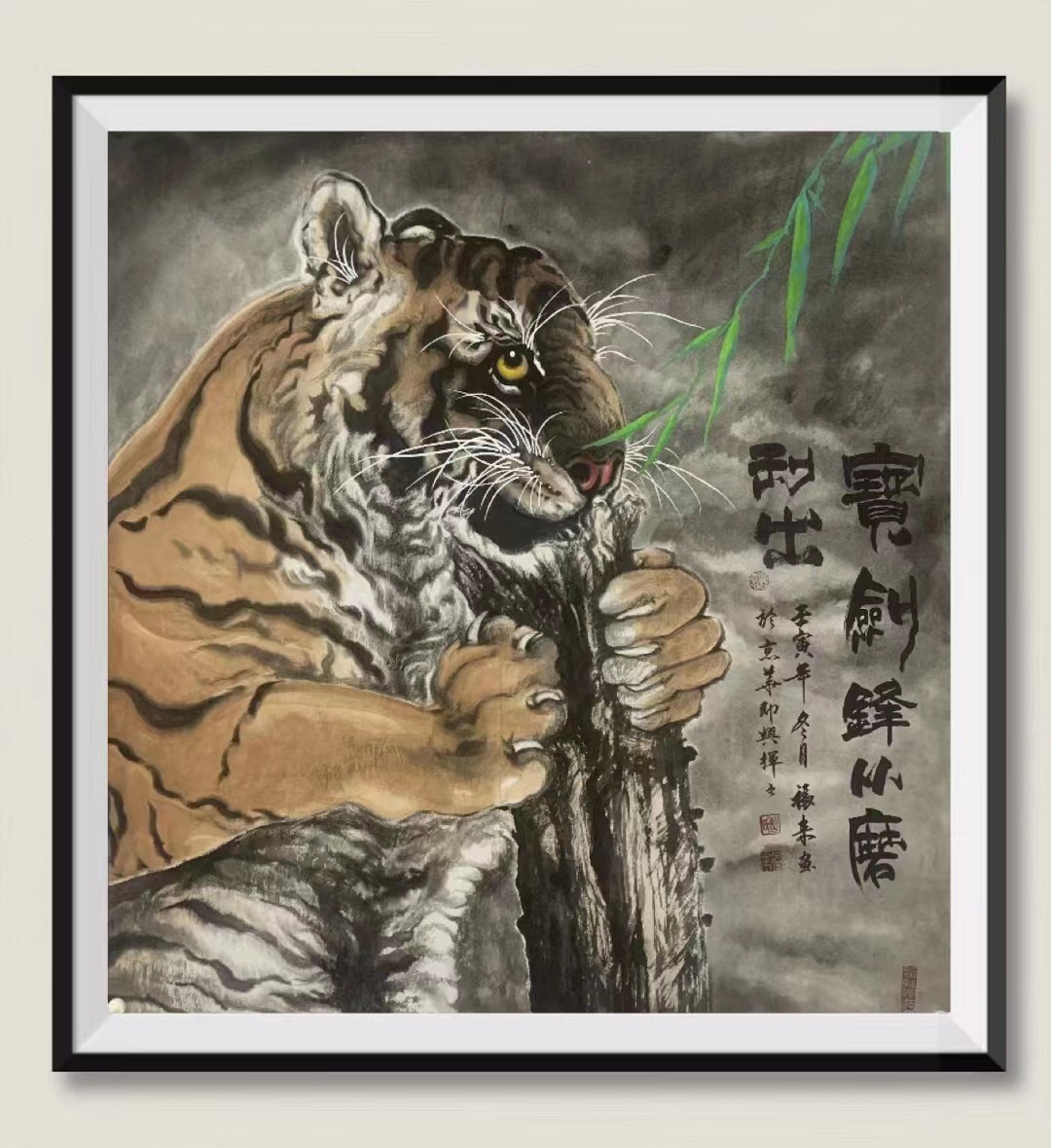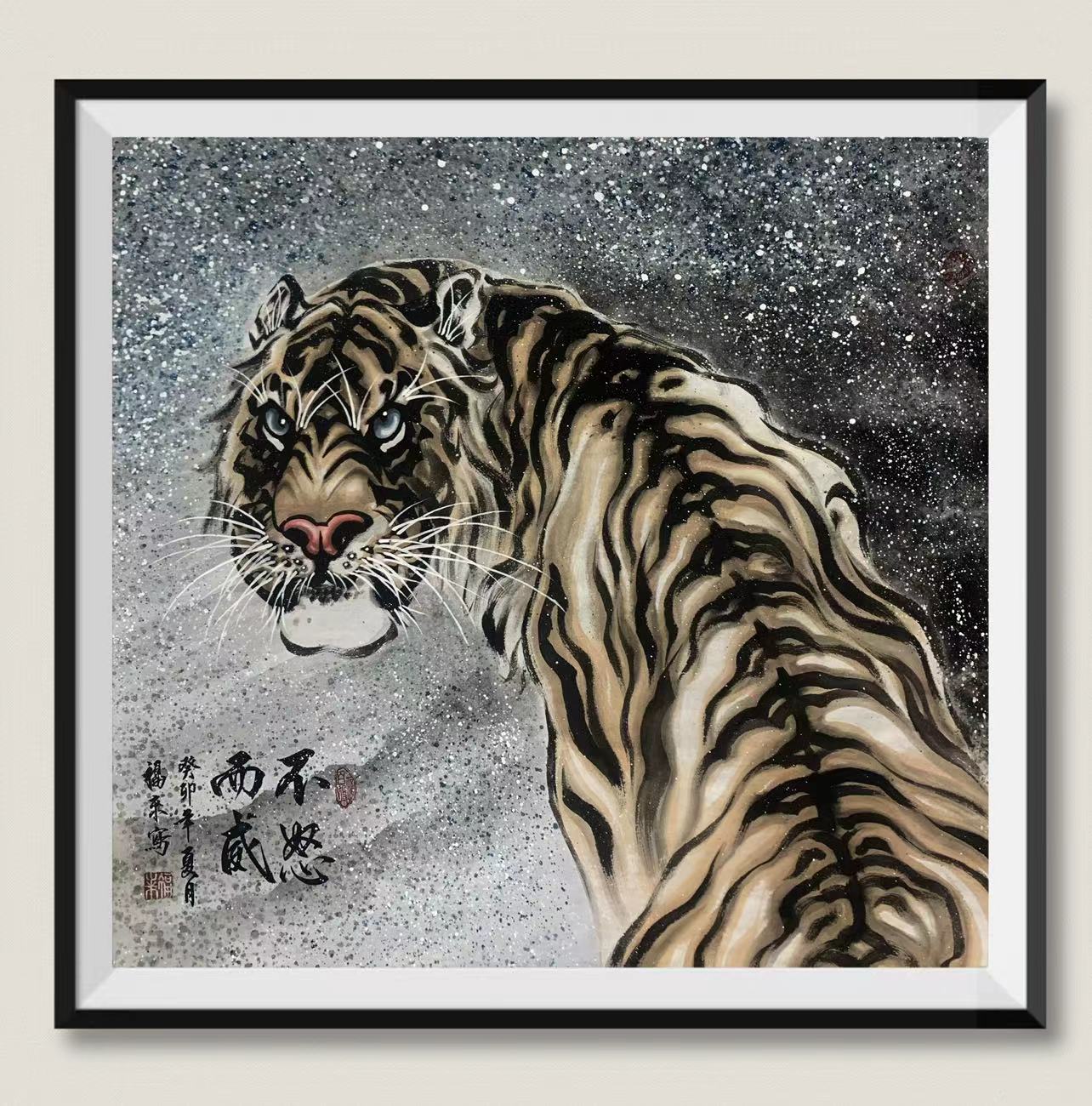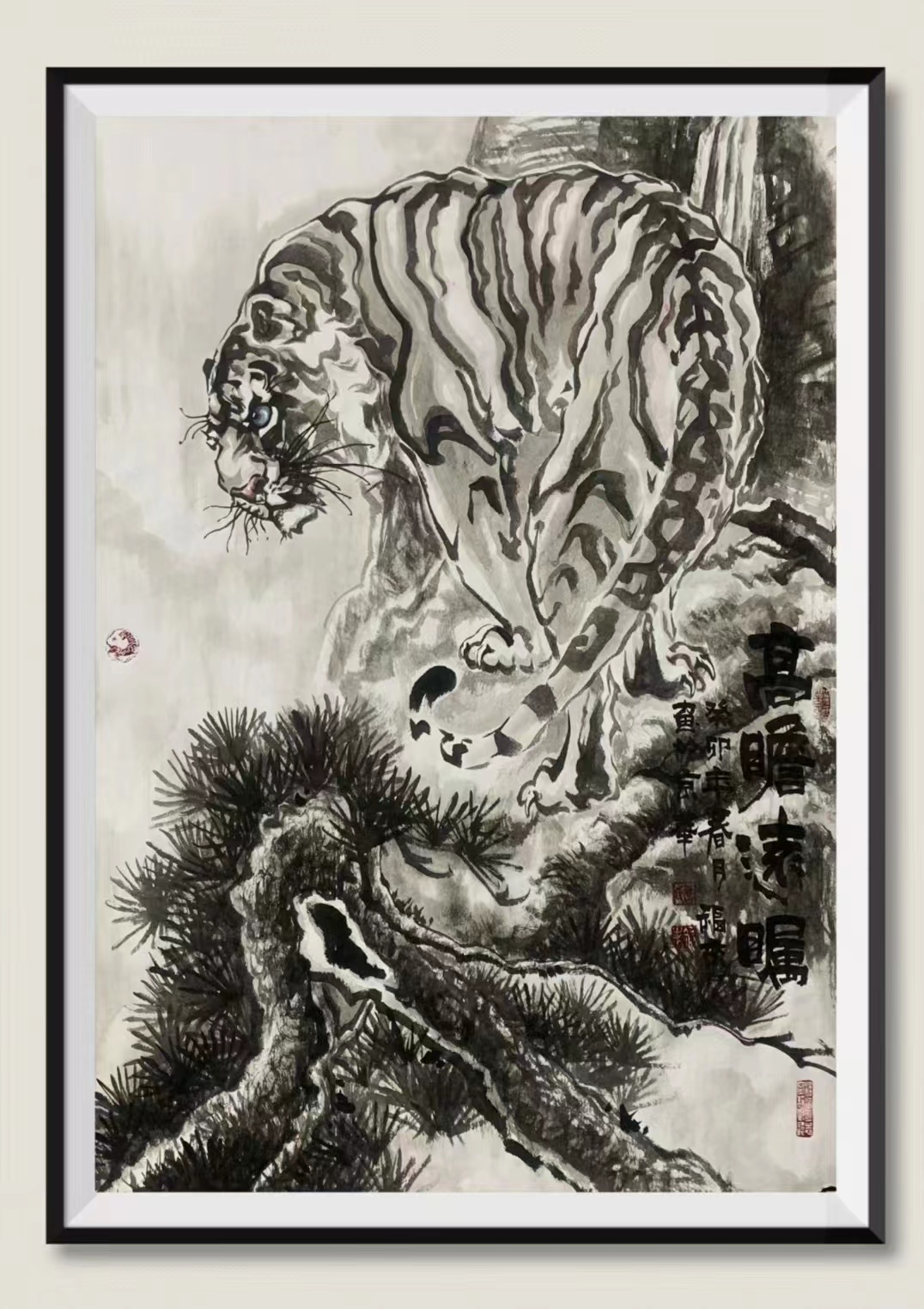 曹福来,1983年生于北京,震风堂弟子,大风堂第五代传人,房山区书法家协会会员,房山区美术家协会会员。自幼喜爱书法,绘画,拜师著名书法家刘作强先生,学习书法,先习楷书,欧体入手,蒙先生悉心教导,书艺得到飞速进步。而后又先后学习了颜体赵体,隶书多有涉猎,擅长隶书,主学曹全碑,张迁碑,后学刘炳森隶书。后追随苏联春老师学习画虎和墨竹,山水等题材国画。掌握运笔用墨的绘画技巧,从老师的作品和生活中动物园看到的老虎,捕捉虎的各种姿势和特征,反复练习莫记于心,以心默写,构建自己的造型和笔墨能力,逐步形成了扎实的画虎构图技法,并加入了自己对画虎的理解与想法,赋予虎情绪化,灵动性,人格化,使所画的虎有了新的意境。经过了多年的的努力和钻研,作品水平逐步提高。受到各界人士好评。