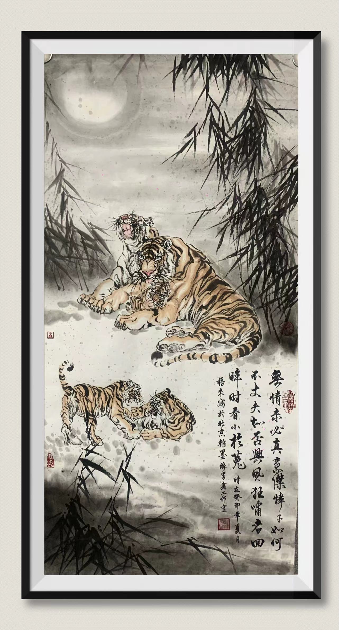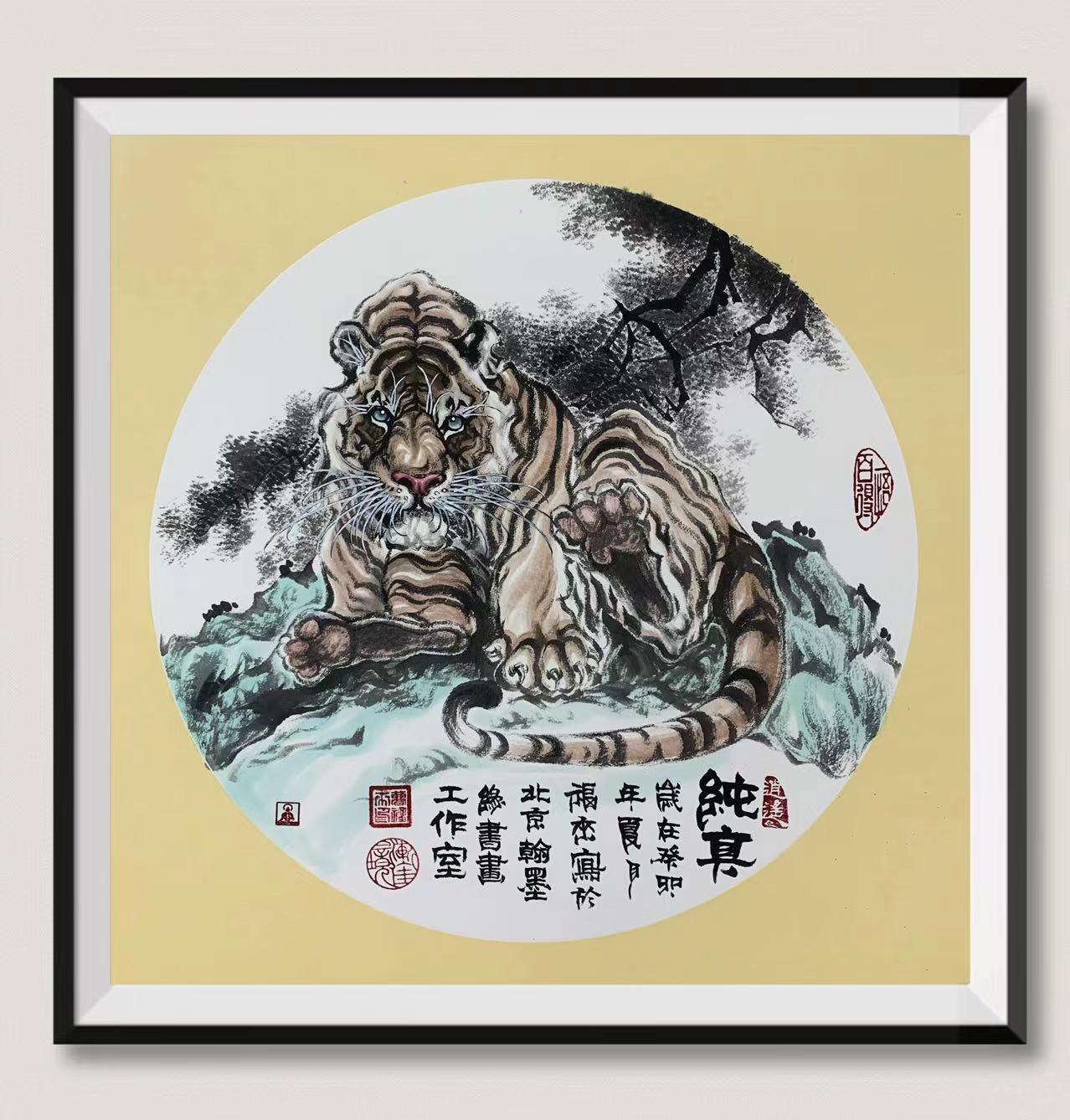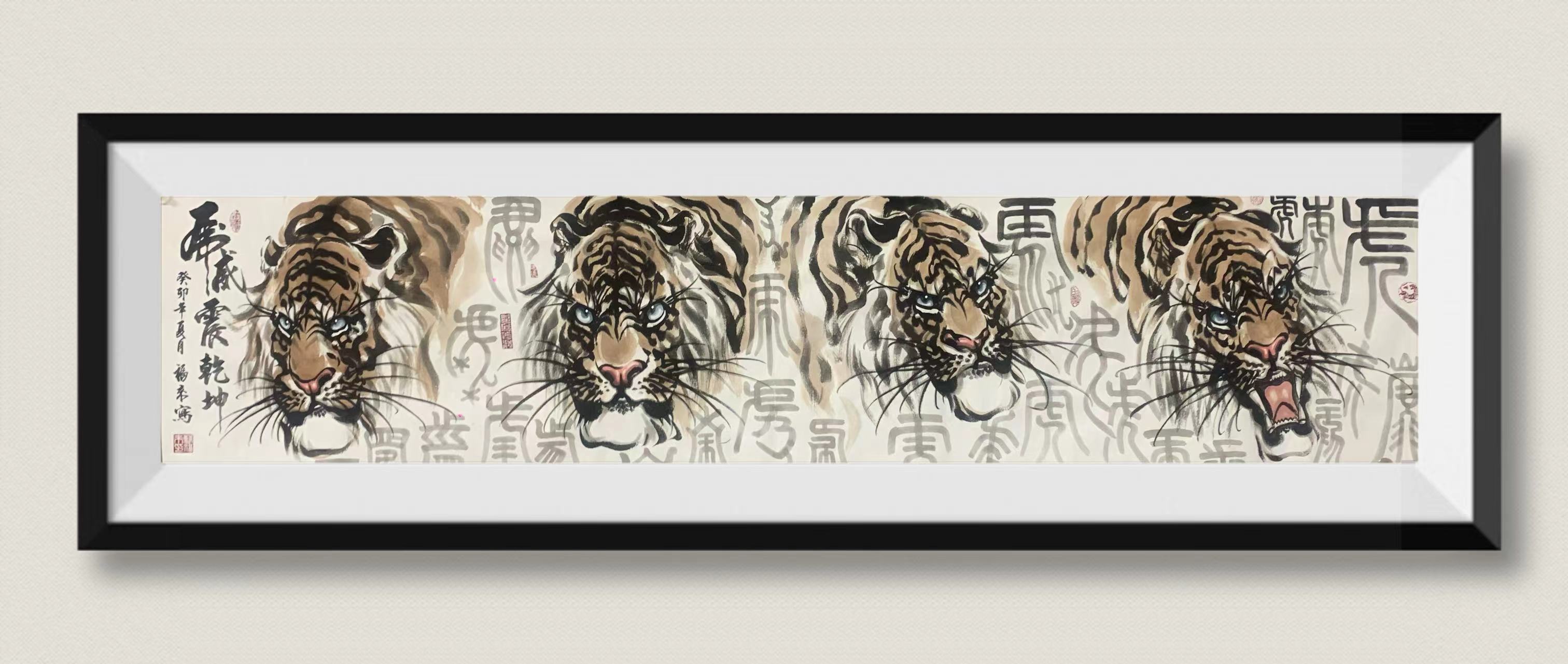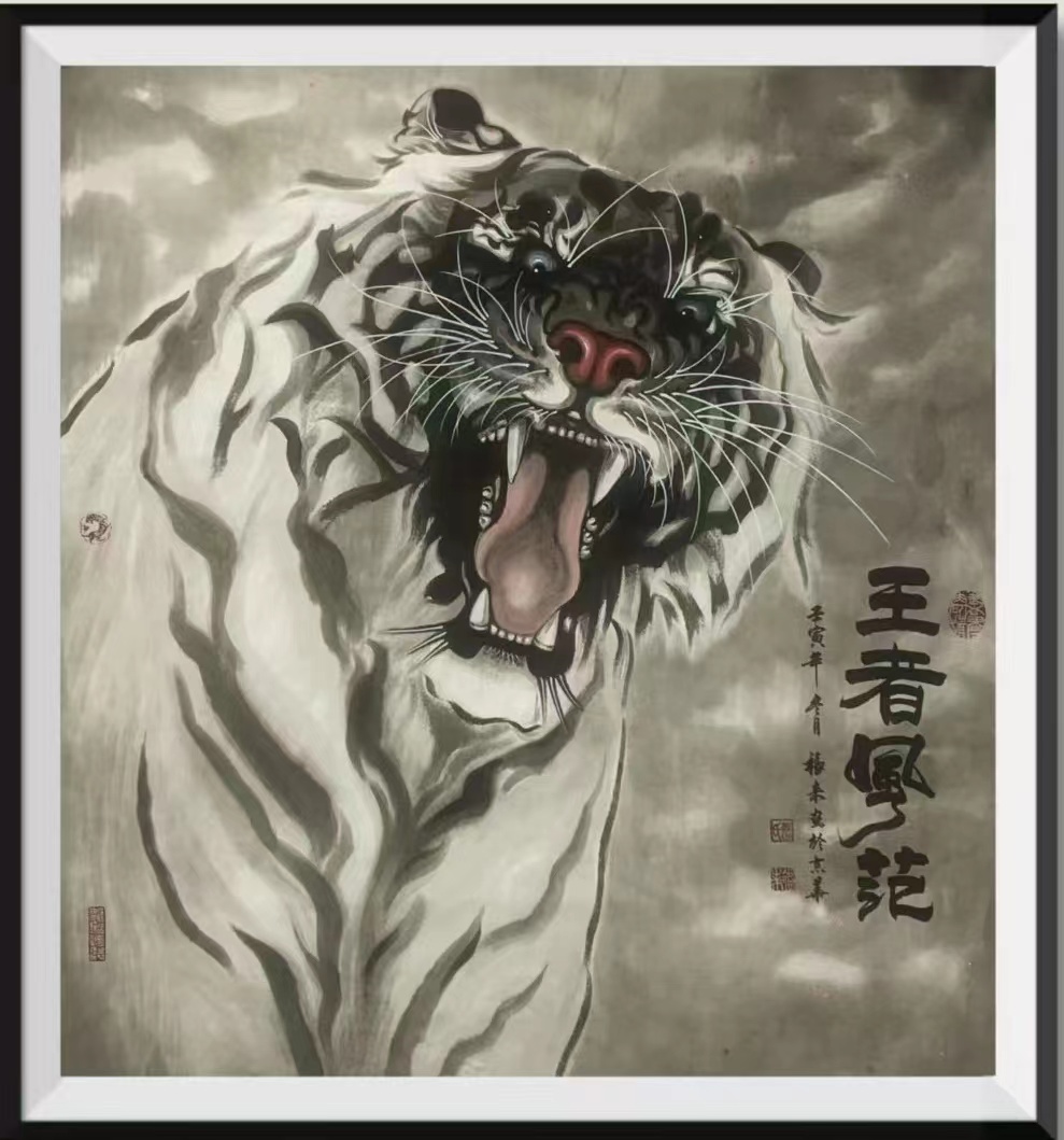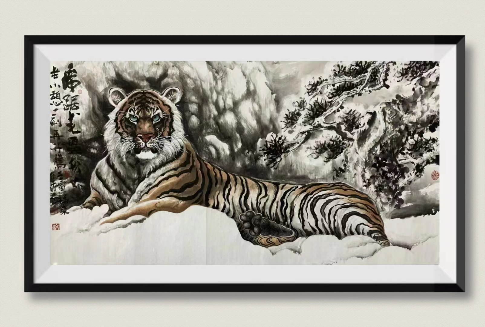 曹福来,1983年生于北京,震风堂弟子,大风堂第五代传人,房山区书法家协会会员,房山区美术家协会会员。自幼喜爱书法,绘画,拜师著名书法家刘作强先生,学习书法,先习楷书,欧体入手,蒙先生悉心教导,书艺得到飞速进步。而后又先后学习了颜体赵体,隶书多有涉猎,擅长隶书,主学曹全碑,张迁碑,后学刘炳森隶书。后追随苏联春老师学习画虎和墨竹,山水等题材国画。掌握运笔用墨的绘画技巧,从老师的作品和生活中动物园看到的老虎,捕捉虎的各种姿势和特征,反复练习莫记于心,以心默写,构建自己的造型和笔墨能力,逐步形成了扎实的画虎构图技法,并加入了自己对画虎的理解与想法,赋予虎情绪化,灵动性,人格化,使所画的虎有了新的意境。经过了多年的的努力和钻研,作品水平逐步提高。受到各界人士好评。