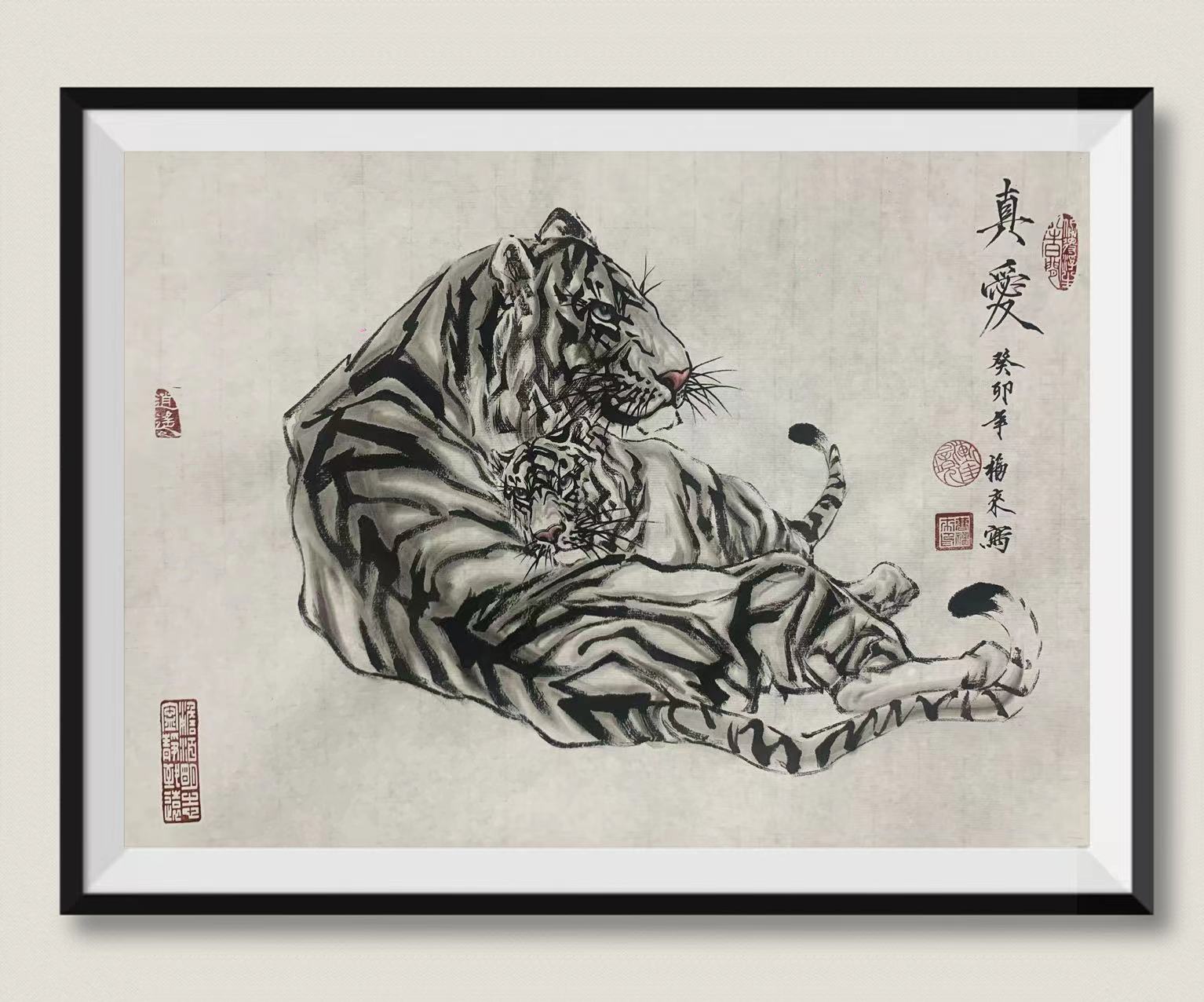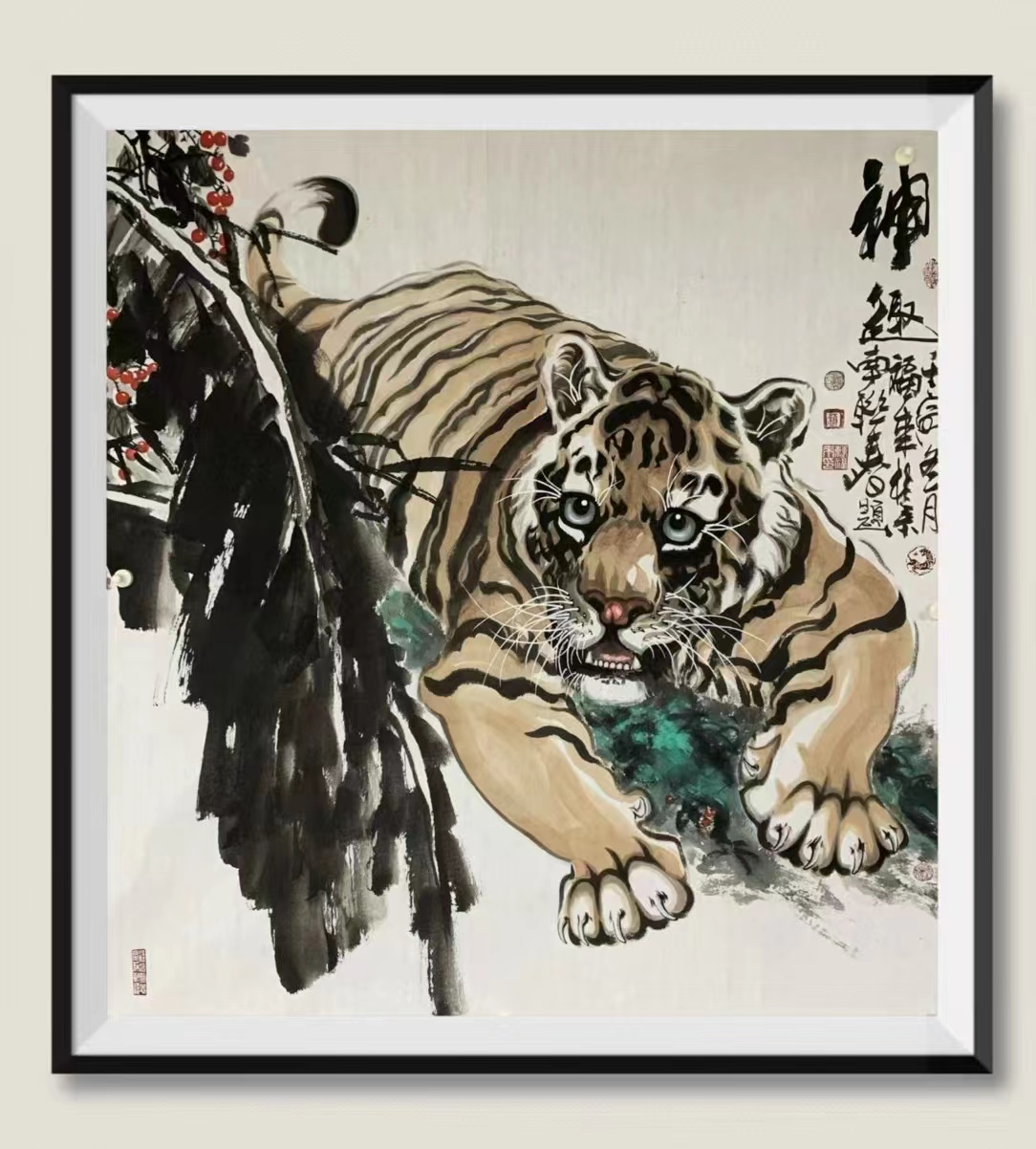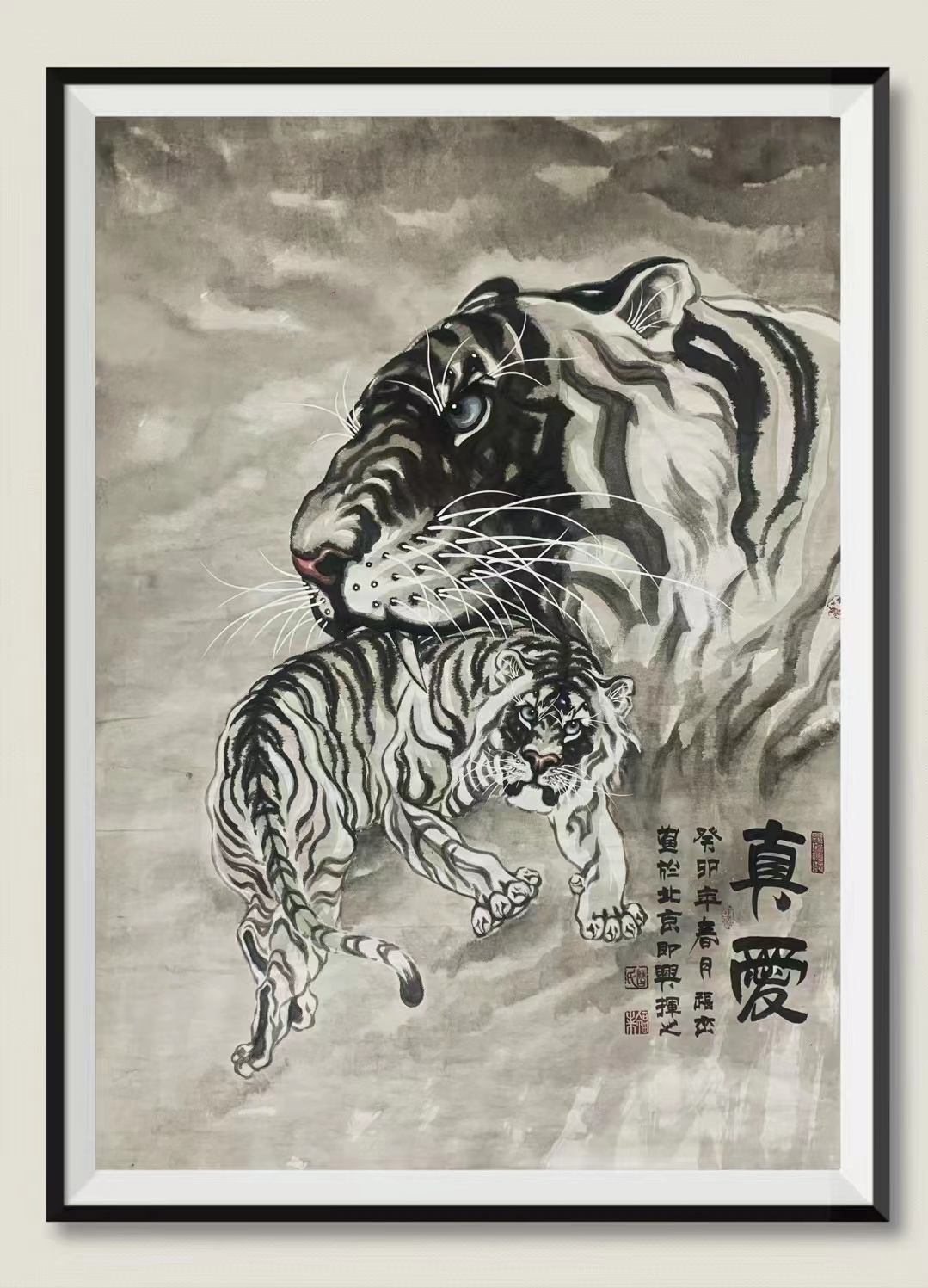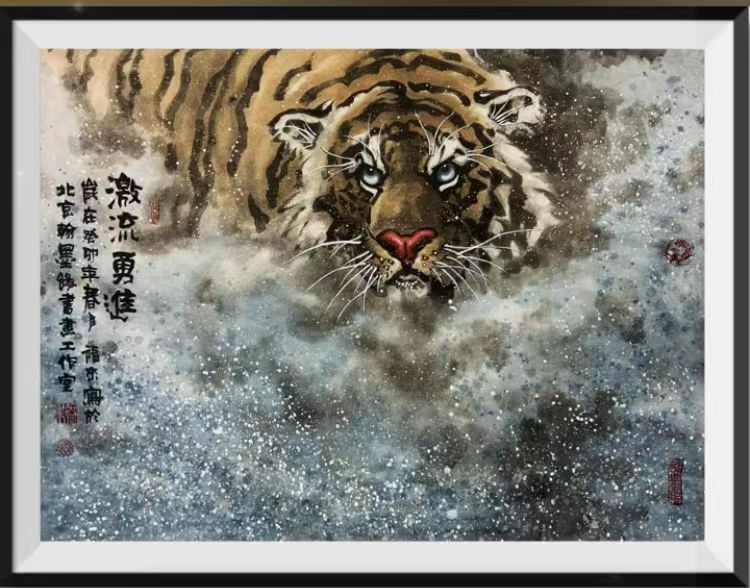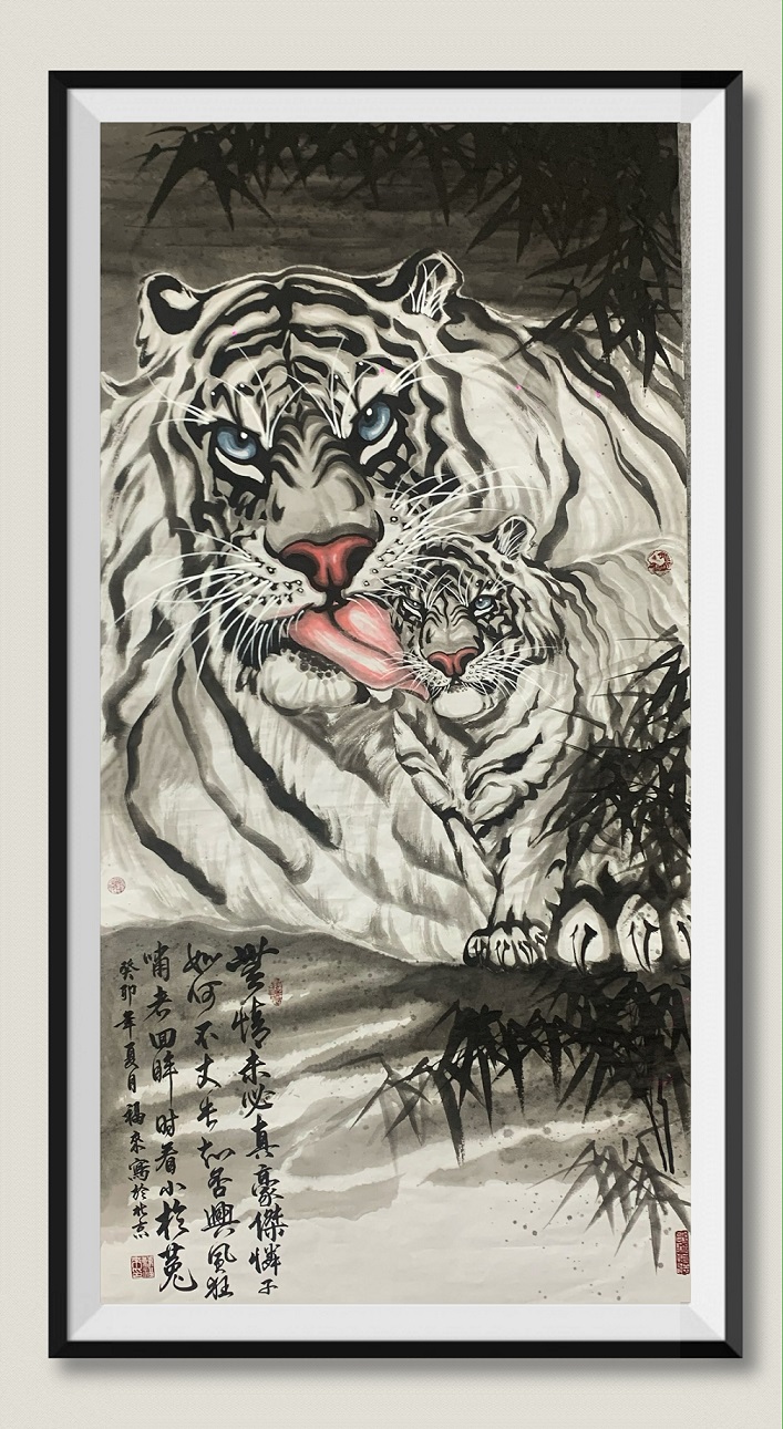 曹福来,1983年生于北京,震风堂弟子,大风堂第五代传人,房山区书法家协会会员,房山区美术家协会会员。自幼喜爱书法,绘画,拜师著名书法家刘作强先生,学习书法,先习楷书,欧体入手,蒙先生悉心教导,书艺得到飞速进步。而后又先后学习了颜体赵体,隶书多有涉猎,擅长隶书,主学曹全碑,张迁碑,后学刘炳森隶书。后追随苏联春老师学习画虎和墨竹,山水等题材国画。掌握运笔用墨的绘画技巧,从老师的作品和生活中动物园看到的老虎,捕捉虎的各种姿势和特征,反复练习莫记于心,以心默写,构建自己的造型和笔墨能力,逐步形成了扎实的画虎构图技法,并加入了自己对画虎的理解与想法,赋予虎情绪化,灵动性,人格化,使所画的虎有了新的意境。经过了多年的的努力和钻研,作品水平逐步提高。受到各界人士好评。