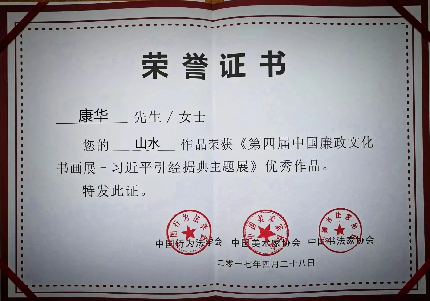 康华先生在2017年中国廉政书画展获得优秀作品奖项